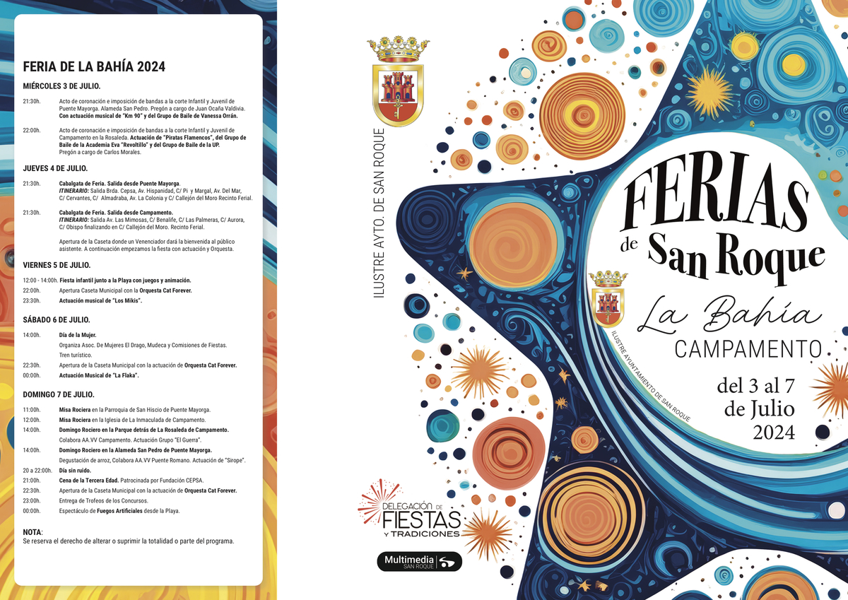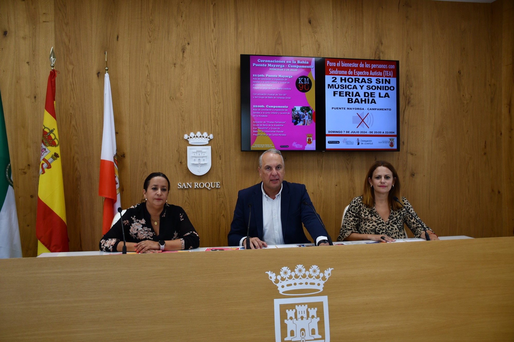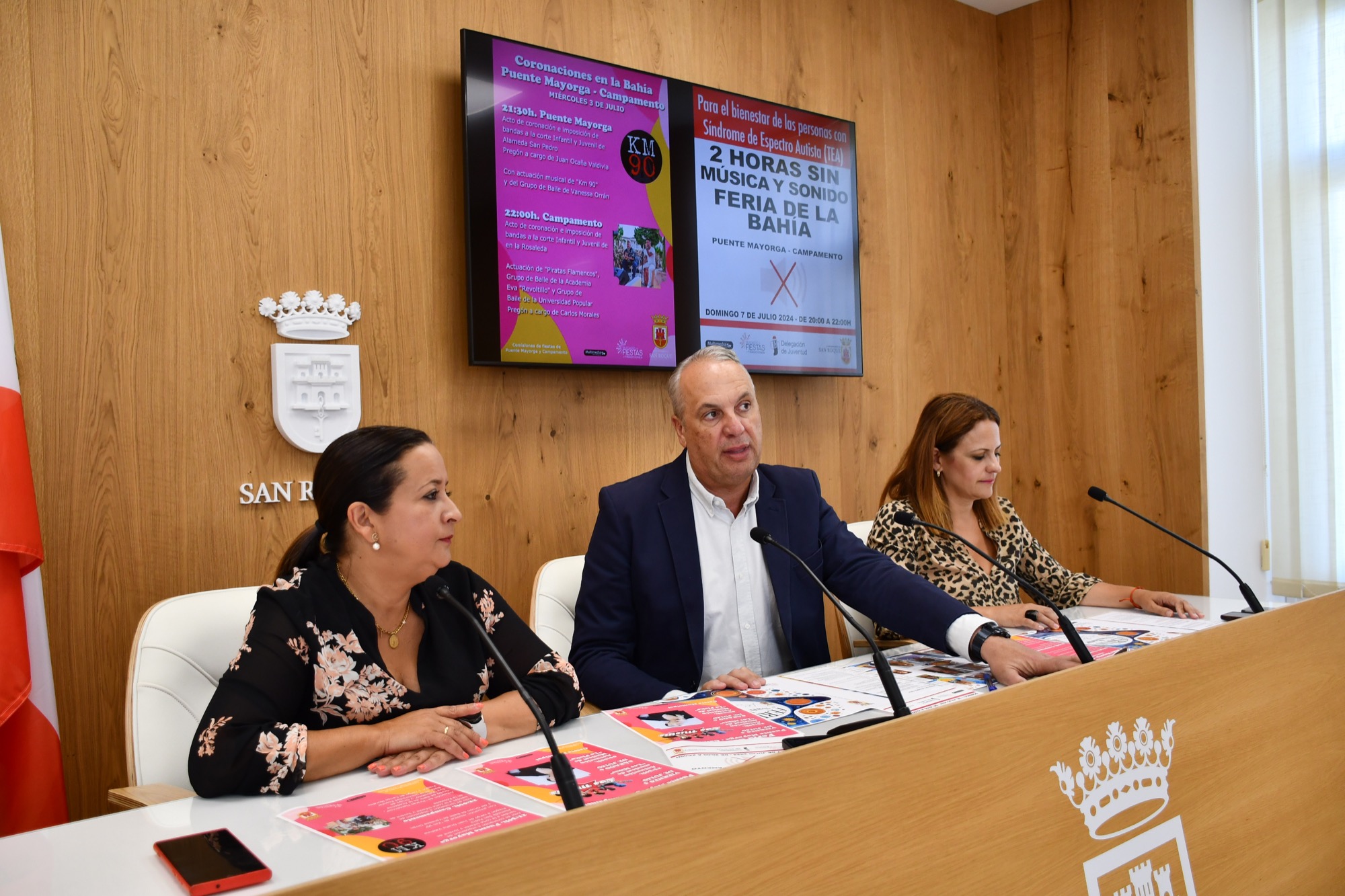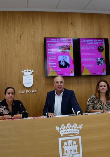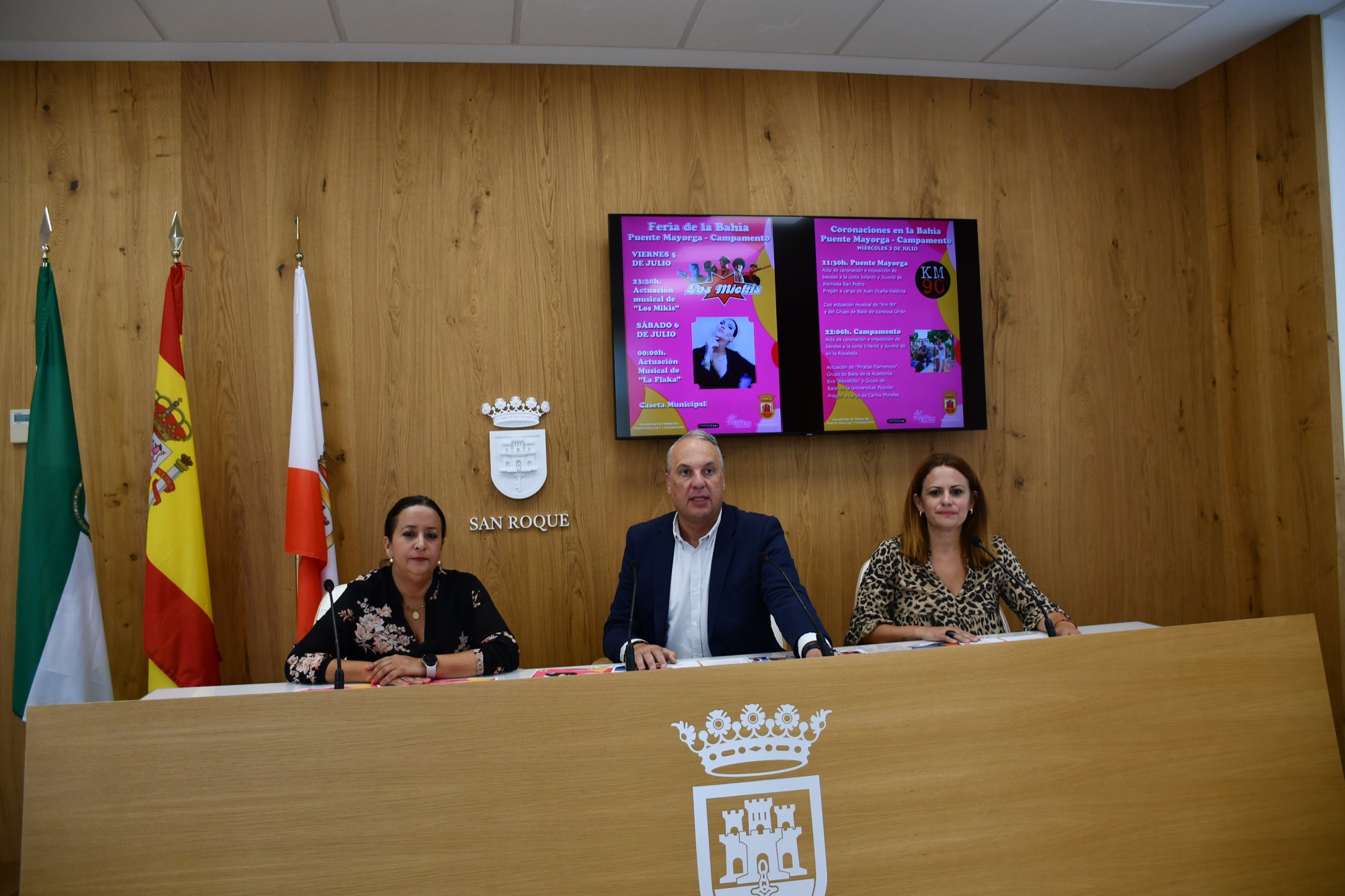 El próximo miércoles 3 de julio da comienzo la Feria de la Bahía, en Campamento y Puente Mayorga, con numerosas actividades que se van a prolongar hasta el domingo 7 de julio. El alcalde de San Roque, Juan Carlos Ruiz Boix, y la teniente de alcalde de Fiestas, María del Mar Collado, han presentado el programa de actos preparados por las comisiones de fiestas y el Ayuntamiento.