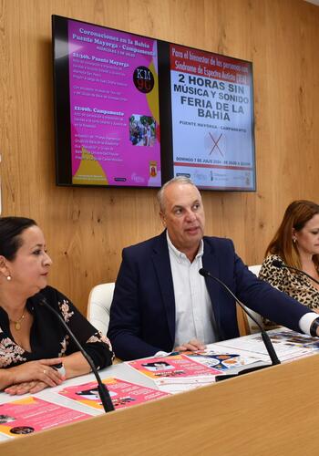 El alcalde, Juan Carlos Ruiz Boix, junto a la teniente de alcalde delegada de Fiestas, María del Mar Collado, ha presentado la tercer feria del municipio, la Feria de la Bahía, que comienza el miércoles 3 y finaliza el domingo 7 de julio.