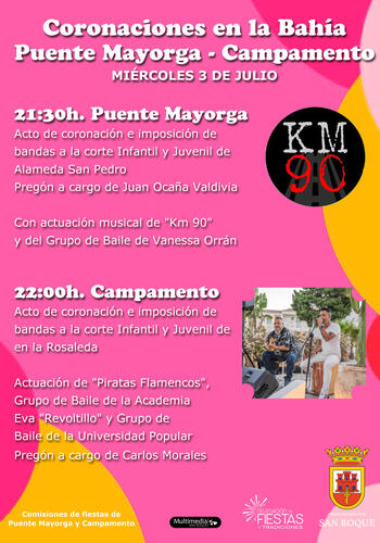 Por tanto, el miércoles 3 de julio los actos se inician con las Coronaciones de las Reinas de Puente Mayorga y Campamento. A las 21:30 horas tendrá lugar en la Alameda San Pedro el acto de coronación e imposición de bandas a la corte Infantil y Juvenil de Puente Mayorga.