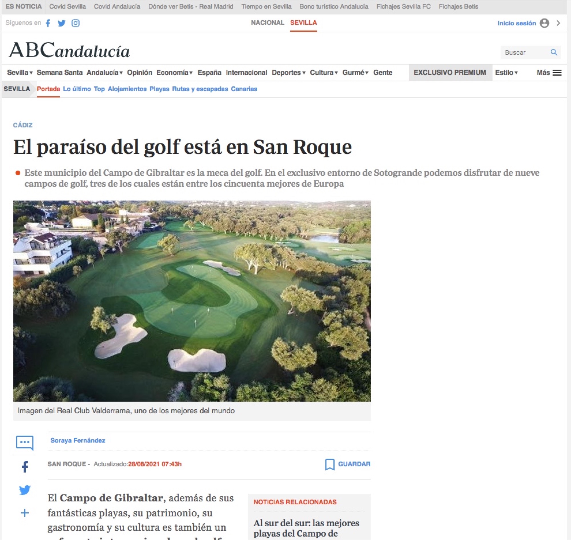 El reportaje, publicado el pasado sábado en la sección Viajar, se titula “El paraíso del golf está en San Roque”. Se puede leer íntegramente en el siguiente enlace: https://sevilla.abc.es/viajar/sevi-paraiso-golf-esta-san-roque-202108280743_noticia.html#vca=rrss-inducido&vmc=abcdesevilla-es&vso=wh&vli=noticia.foto.