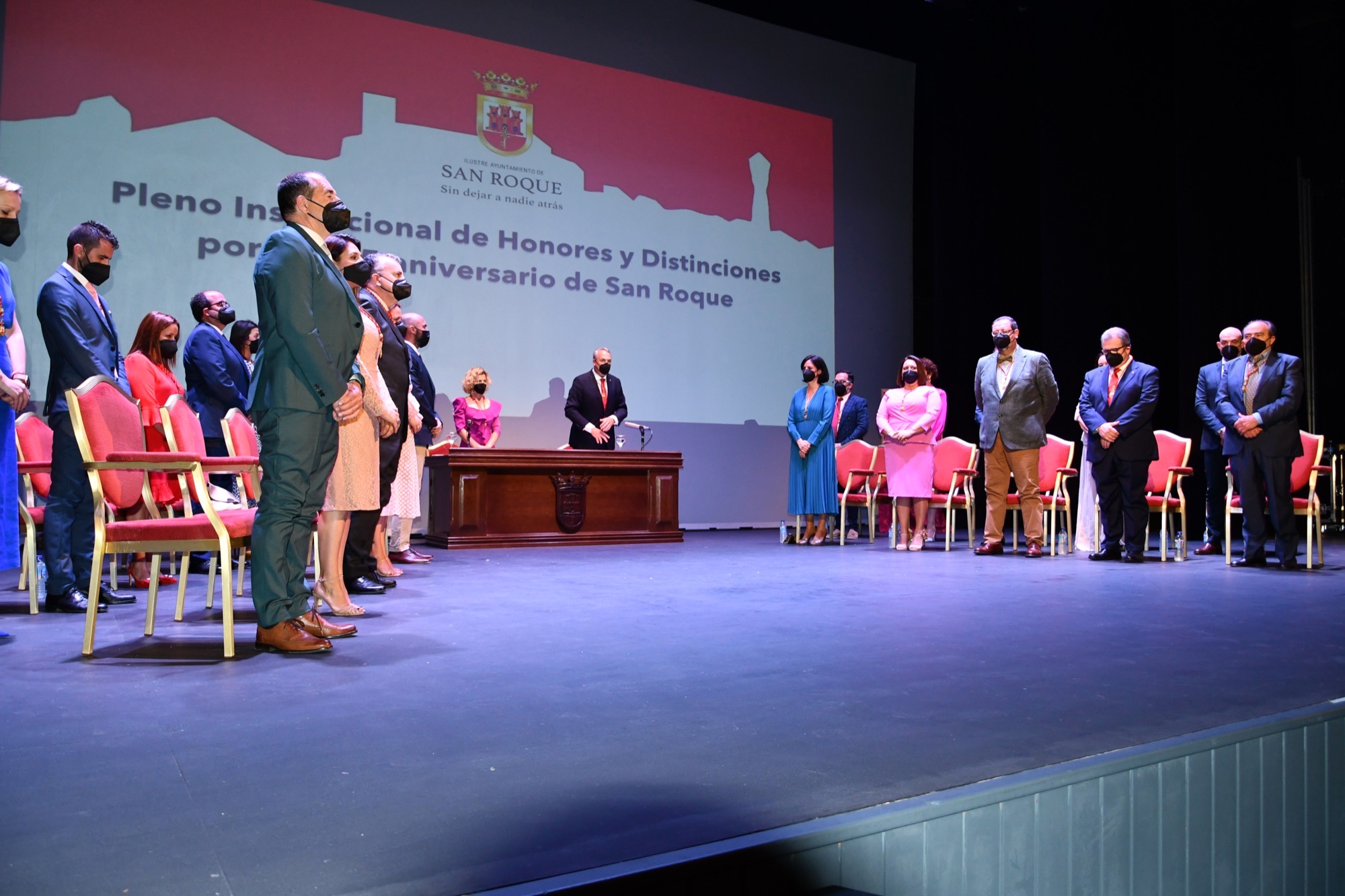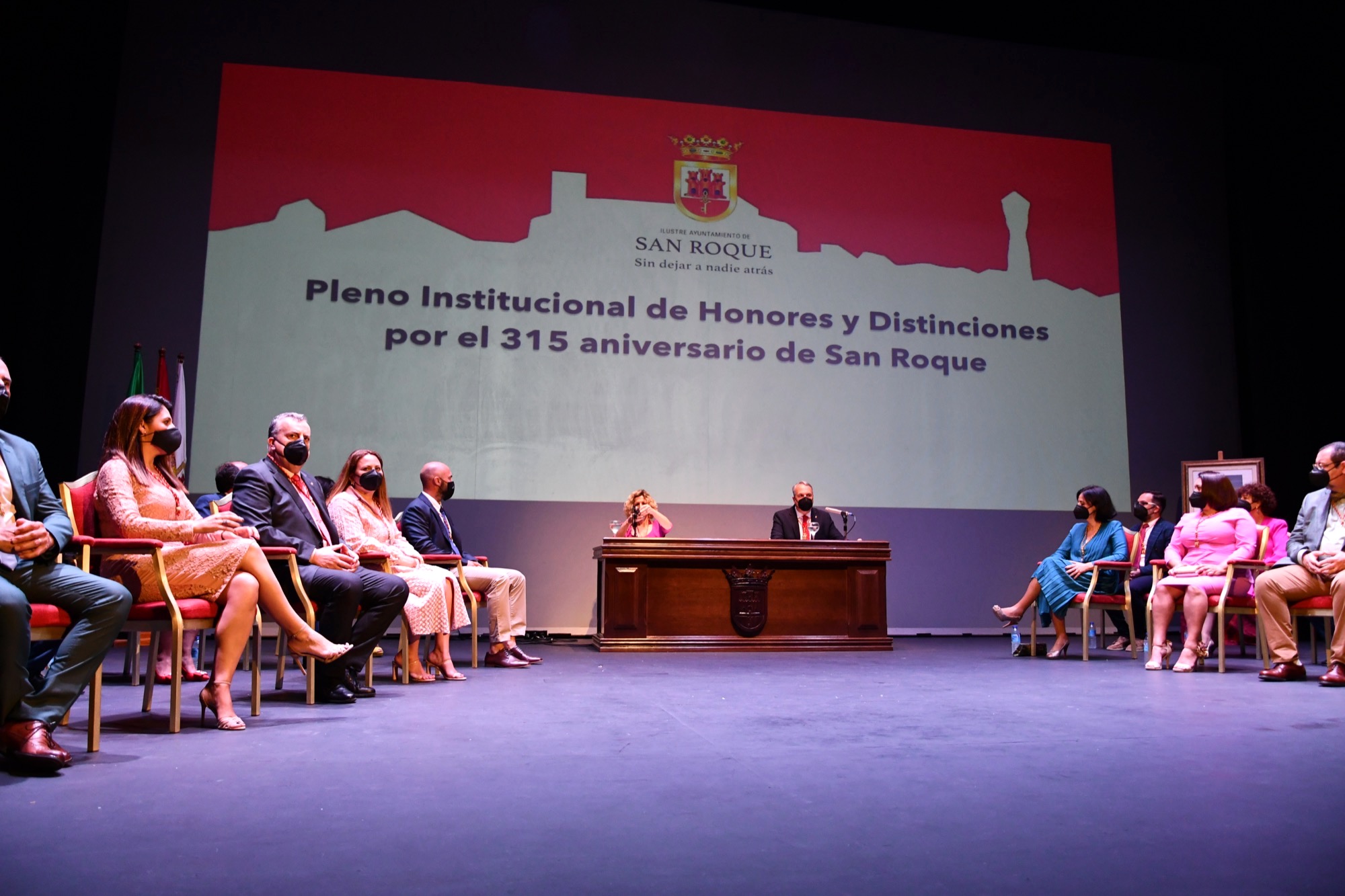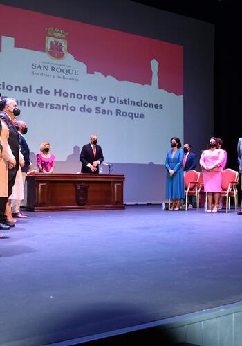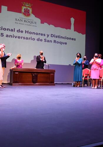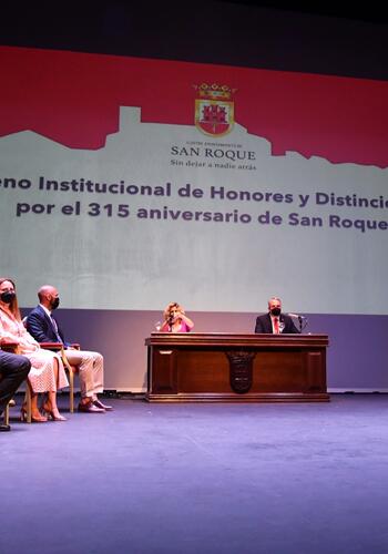 El Teatro Juan Luis Galiardo ha acogido en la mañana de hoy, viernes, el Pleno Institucional con motivo del 315 Aniversario de la Fundación de San Roque, donde además de los reconocimientos correspondientes a 2021 se han otorgado los que se aprobaron para 2020 y no pudieron ser entregados debido al confinamiento por la pandemia de COVID-19. En total, se trata de ocho Medallas de Oro de la Ciudad, un título de Hijo Predilecto, otro de Miembro Honorario de la Corporación, uno de Sanroqueña del Año y siete Menciones de Honor, tres de ellas a título póstumo.