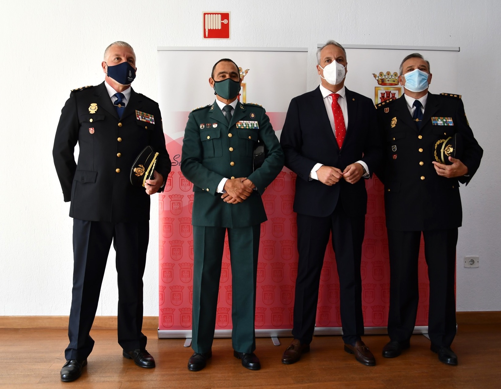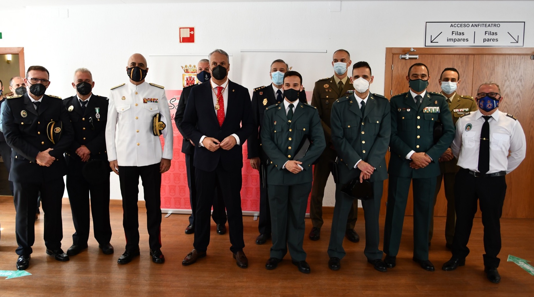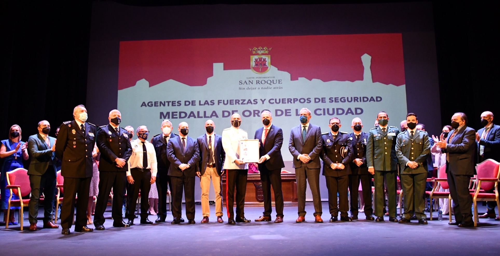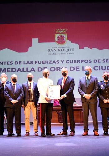 En lo referente a la Medalla de Oro correspondiente a las Fuerzas y Cuerpos de Seguridad, los reconocimientos fueron entregados por el teniente de alcalde Juan Manuel Ordóñez y por el alcalde. Como representantes de la Policía Local de San Roque, subieron al escenario el jefe de dicho departamento, Pedro Luis González, y Andrés Campoy; por el Consorcio Provincial de Bomberos, el presidente del mismo, Francisco Vaca, y jefe del Parque de Bomberos de La Alcaidesa, José Canas; el general de Brigada José Luis Souto, en representación de la Operación Balmis de la Infantería de Marina; los comisarios de La Línea y de Algeciras, Antonio Delgado y Francisco López Matesanz, recogieron los correspondientes a la Policía Nacional; como representante de la Seguridad Privada, el encargado fue Darío Cortón Mauriz; como coordinador de los voluntarios de Protección Civil de San Roque, José Antonio Delgado; y en lo referente a la Guardia Civil, lo recogieron Francisco Almansa, coronel de la Comandancia de Algeciras, y el comandante del puesto de San Roque, Sergio Alés.