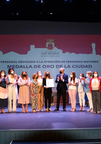 En cuanto a la Medalla de Oro para el personal de atención a las personas mayores, los galardones fueron entregados por el alcalde y por la teniente de alcalde Mónica Córdoba. Como representantes de la Residencia Municipal de San Roque Casco, recibieron el reconocimiento su directora, Patricia Pérez, junto a Natalia Romero y Ana Rojas; en cuanto a la Residencia de Mayores La Milagrosa, se entregó a su directora, María Ríos Lechuga, así como a Josefa Lara González y Soraya Sánchez Torres; representando a la Residencia Pergomar, se reconoció a Patricia Bueno y a Moheni Isabel Advant; y, finalmente, en cuanto al personal del Servicio de Ayuda a Domicilio, se otorgó a la coordinadora Pilar Martinez y a Ana Belén Arias Mena.