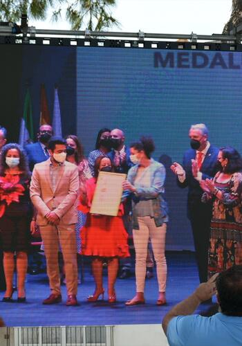 A continuación se fueron nombrando los colectivos que fueron galardonados en 2020 con la Medalla de Oro de la Ciudad, cuyos representantes fueron subiendo al escenario para recoger los reconocimientos.