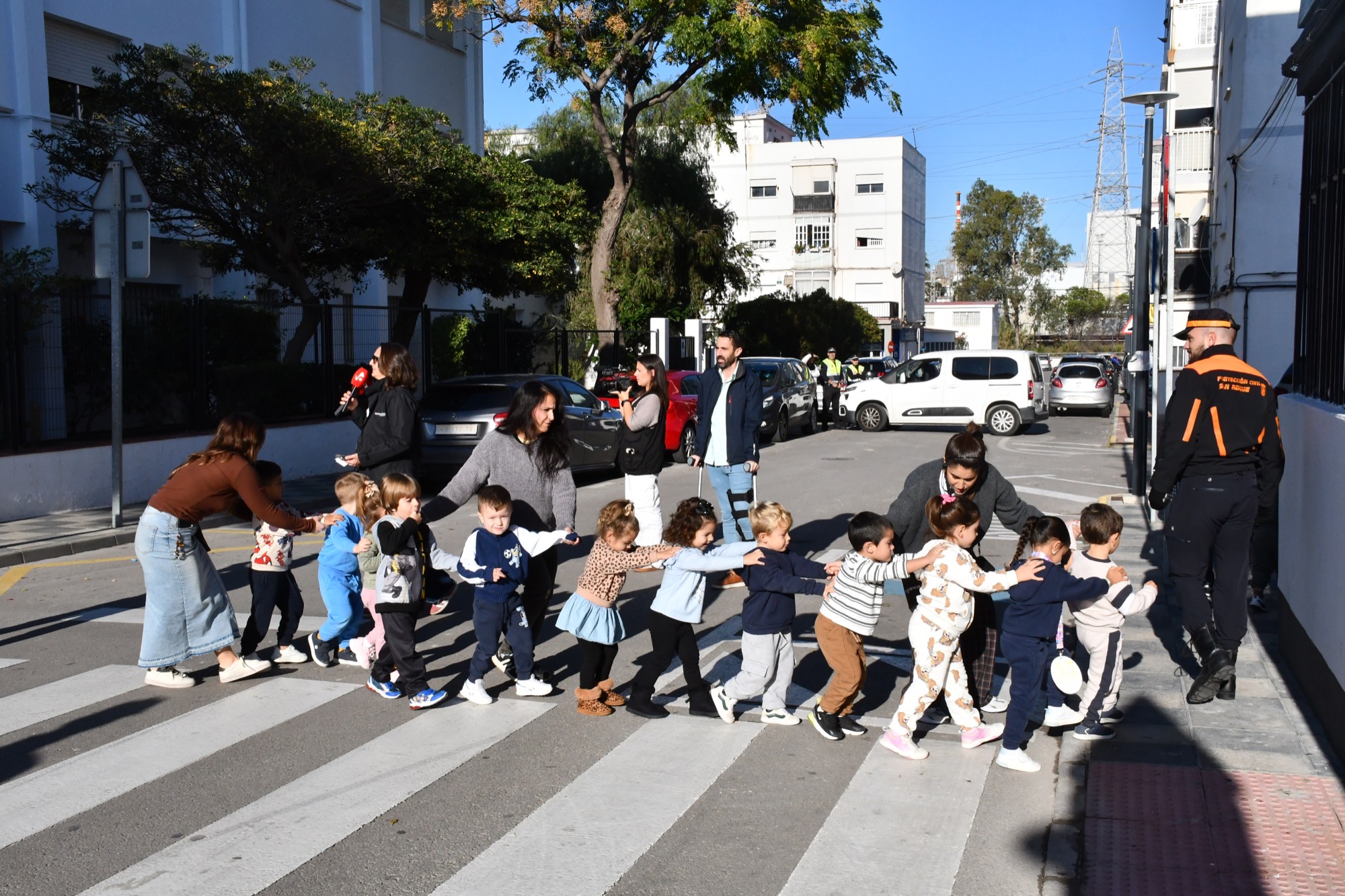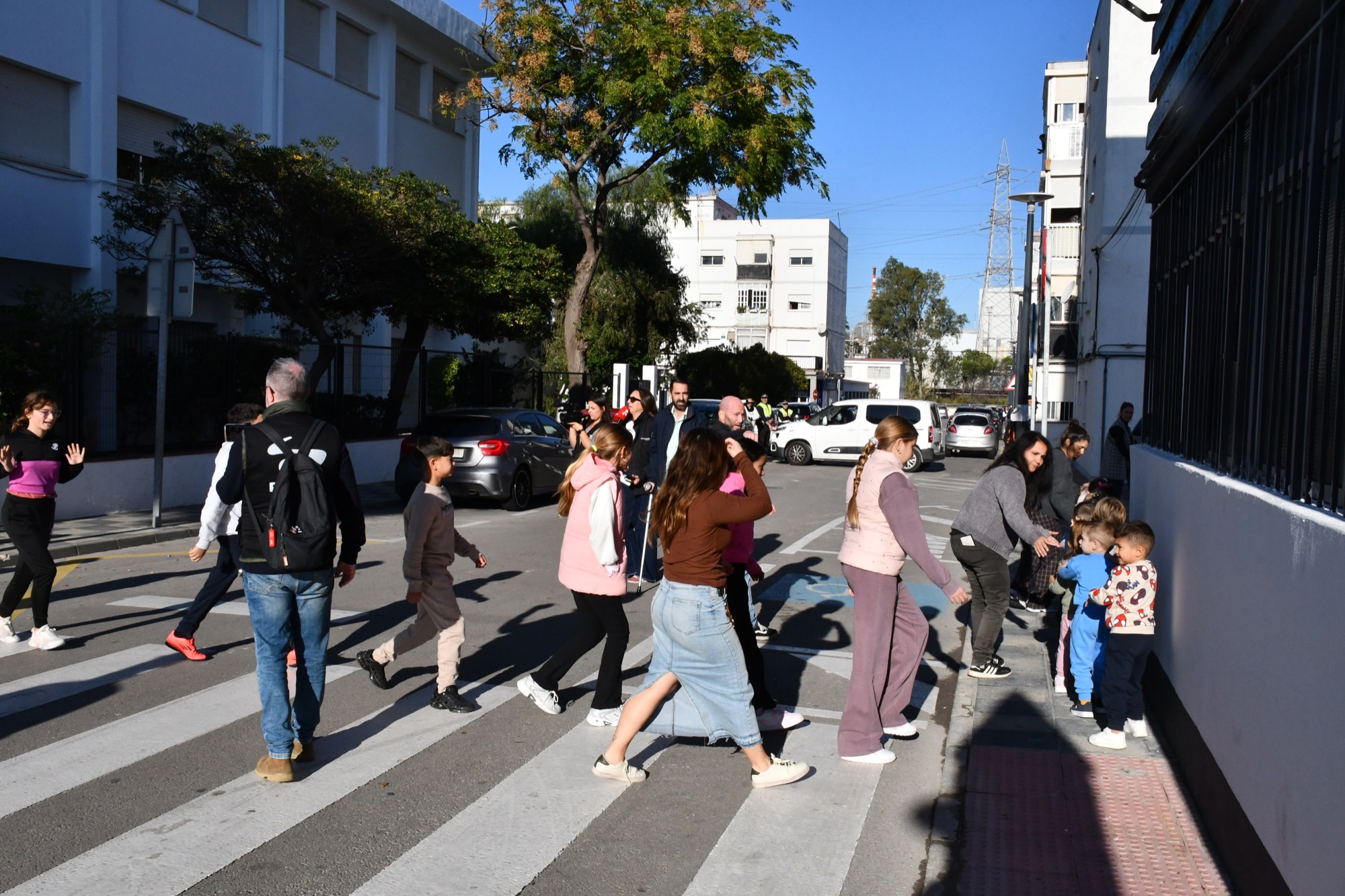Policía Local y Vigilantes cortaron el tráfico de las calles de entrada a los centros educativos para facilitar las evacuaciones. En el caso de Puente Mayorga, el punto de reunión se ubicó en la zona de la barriada de Nazaret junto al Kiosco Botella, mientras que en Campamento se situaba en unos aparcamientos cercanos. En un caso real, unos autobuses deberían haber recogido a niños y niñas para llevarlos a la zona segura, situada en la rotonda de los misiles, frente al acceso al Acuartelamiento Cortijo Buenavista. Pasados unos minutos se dio la orden de volver a las aulas, operación que se realizó con total eficacia.