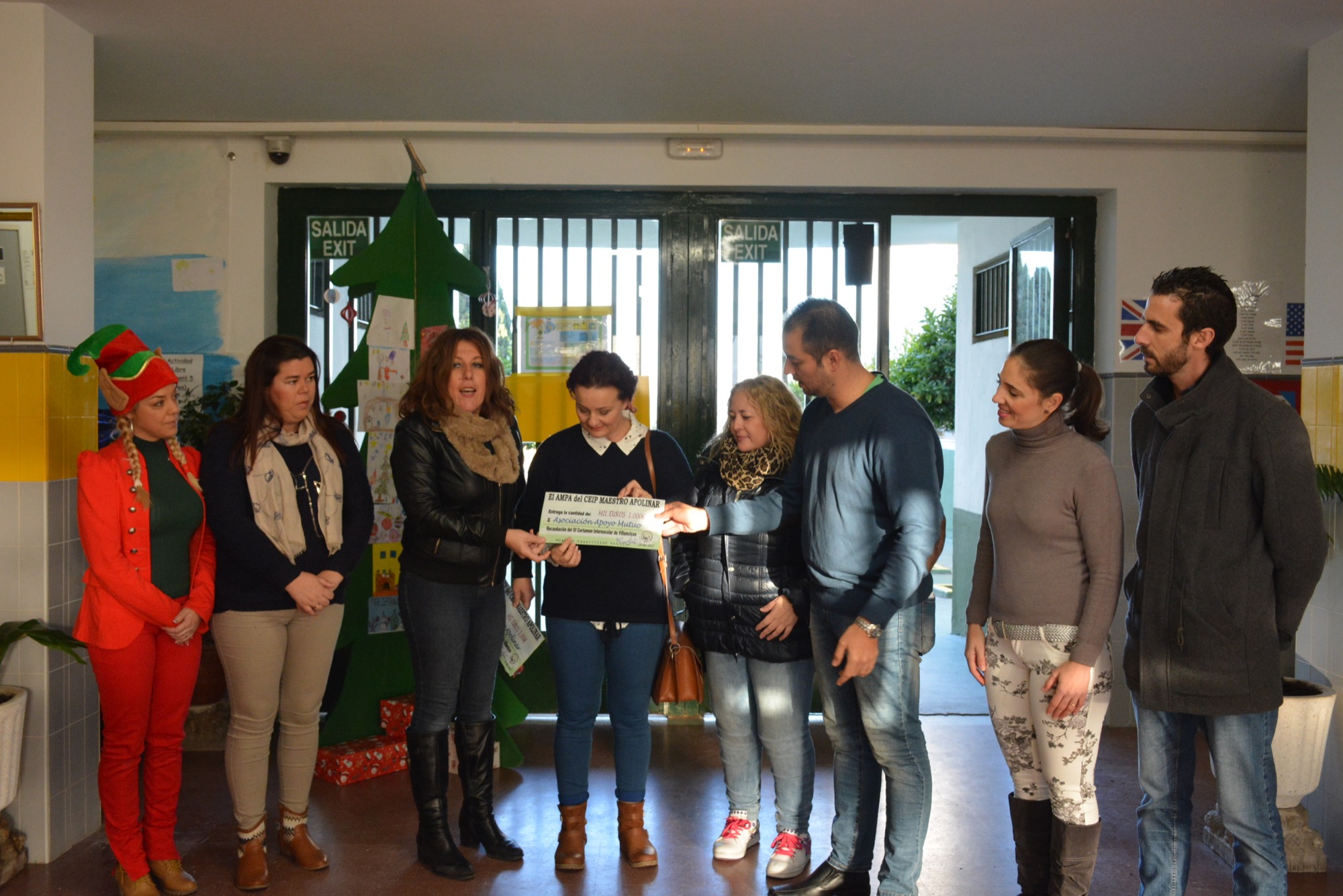 La directiva de la Asociación de Madres y Padres de Alumnos (AMPA) del CEIP Maestro Apolinar ha entregado hoy, viernes, a la Asociación Apoyo Mutuo San Roque y al mismo centro educativo sendos cheques de mil euros, correspondientes a la recaudación del III Certamen Interescolar de Villancicos, que se celebró el pasado día 14. El Ayuntamiento colaboró en la organización de este concurso, que tuvo lugar en el Teatro Juan Luis Galiardo.