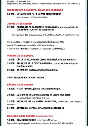 En cuanto a la última jornada, 24 de agosto, el Domingo Rociero comenzará a las 13.30 horas, con una degustación de paella popular para todos los asistentes y la actuación de “Chat’e un laito”. La tarde estará amenizada a partir de las 16.00 horas con música de DJ Lucas Tocón, celebrándose en la Plaza Ortega Brú la multitudinaria Fiesta del Agua.