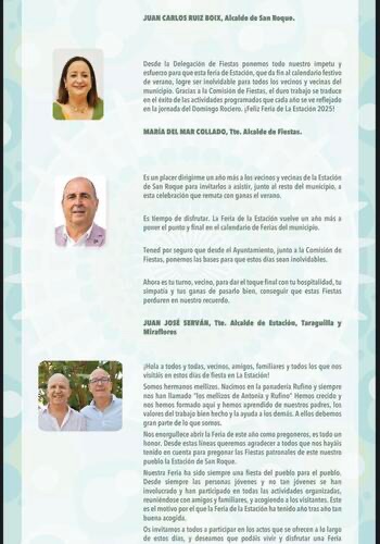 La Cabalgata de Carrozas y Charangas recorrerá en la noche de este jueves las principales calles de la Estación de San Roque para finalizar en el recinto ferial, donde se procederá al encendido del alumbrado especial y a la inauguración de la caseta municipal. En cuanto a la jornada del viernes, a mediodía se celebrará el Día de la Mujer, y a medianoche se disfrutará de la actuación de la jerezana Marina García.