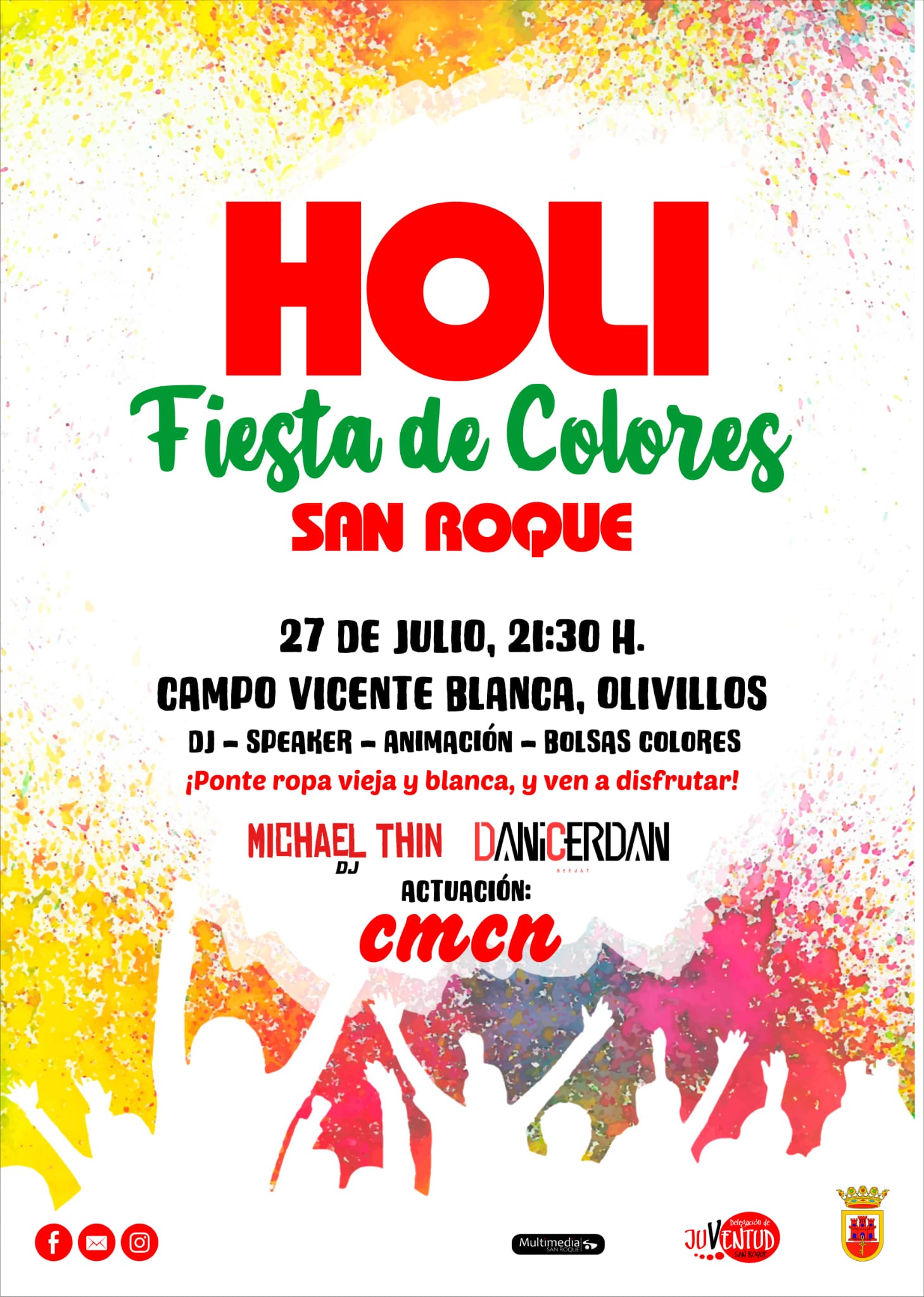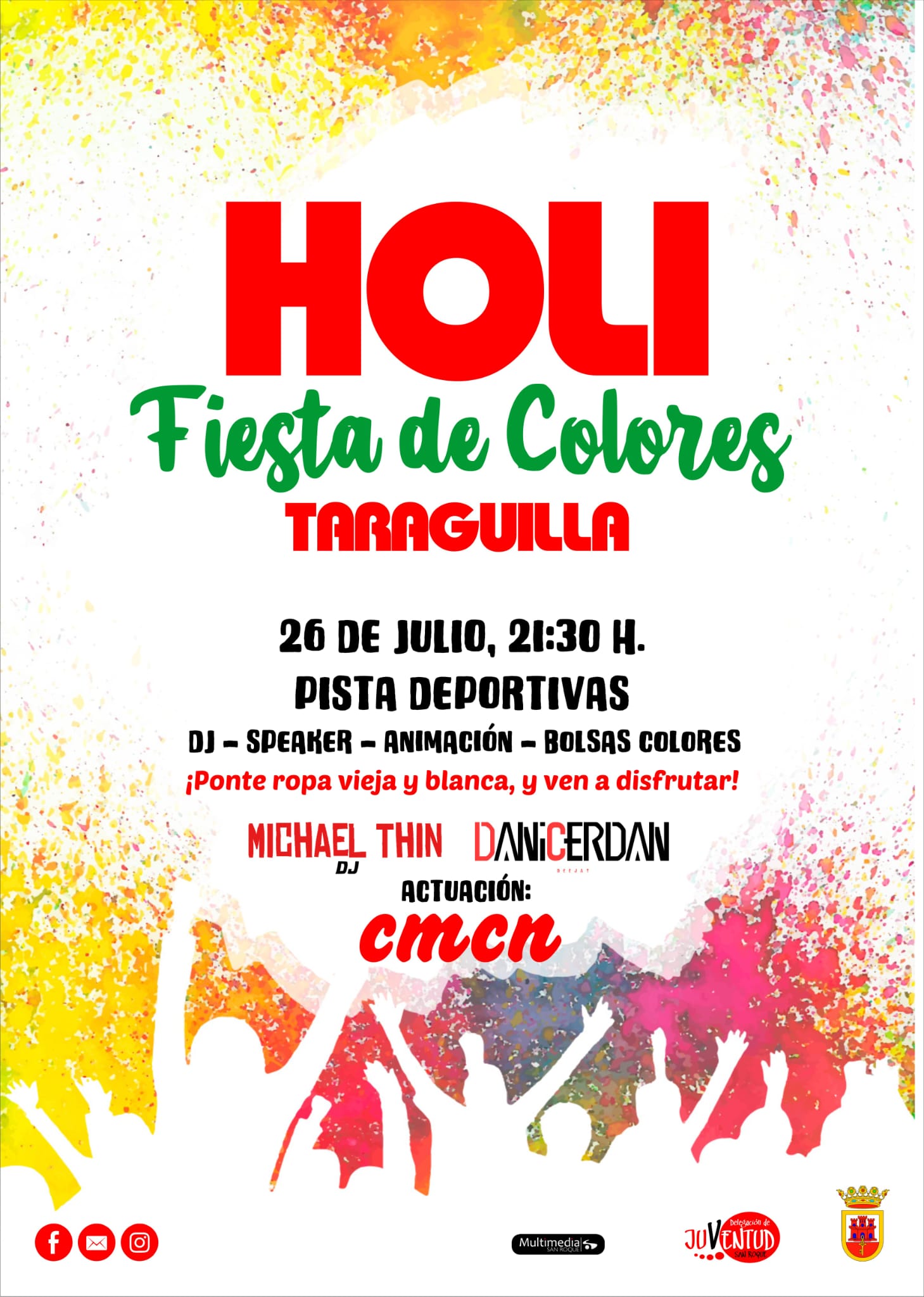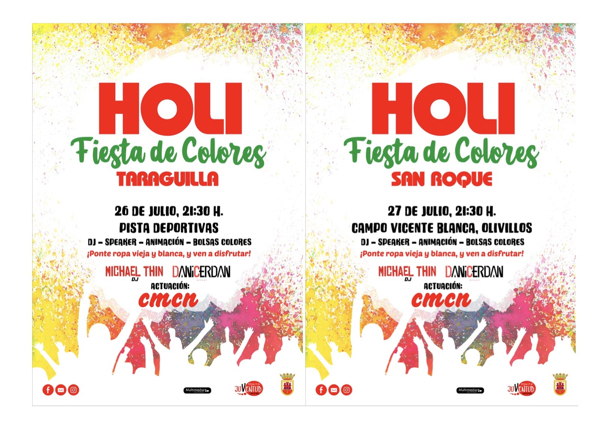 El miércoles 26 de julio se desarrollará en la pista deportiva de Taraguilla, para concluir el jueves 27 en el campo de fútbol municipal “Vicente Blanca” de Los Olivillos, San Roque. Las fiestas se celebrarán a las 21.30 horas, y la asistencia es gratuita. “Holi Fiesta de Colores” cuenta con la organización de la Delegación de Juventud, que dirige el teniente de alcalde David Ramos.