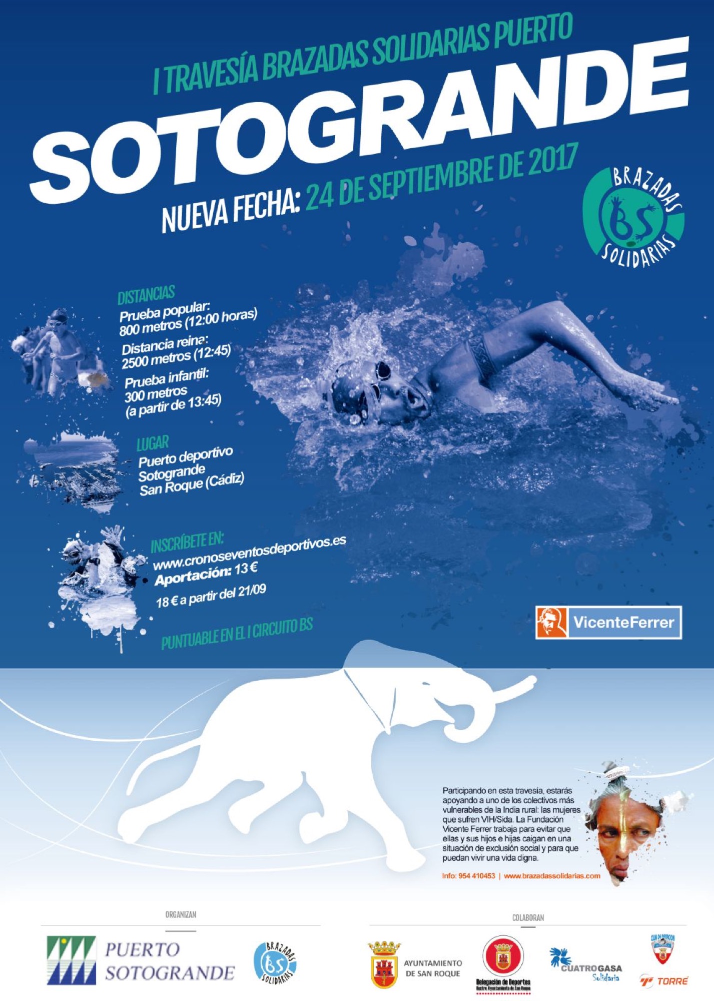 Este domingo, día 24, se celebrará la I Travesía Brazadas Solidarias Puerto Sotogrande, organizada a beneficio de la Fundación Vicente Ferrer. La prueba iba a llevarse a cabo el pasado 6 de agosto, pero el fallecimiento en un accidente en la India de cuatro componentes de esta ONG llevó a su aplazamiento, cuando se contaba con unos 300 inscritos.