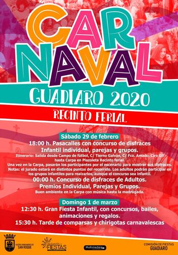 Respecto al Carnaval de Guadiaro, se iniciará mañana sábado a las 18.00 horas con un pasacalles que servirá de concurso de disfraces infantil individual, parejas y grupos, que comenzará en el campo de fútbol para seguir por las calles Tierno Galván, Francisco Amado y Ciro Gil, finalizando en la carpa que se instalará en el Recinto Ferial. Una vez en la carpa, los participantes pasarán por el escenario para mostrar sus disfraces. El jurado se ubicará en distintos puntos del recorrido. Aunque los adultos podrán participar junto a los grupos infantiles, el certamen sólo será de modalidad infantil. Sobre la medianoche, en la carpa, se llevará a cabo el concurso de disfraces de adultos, con premios individual, parejas y grupos. El buen ambiente seguirá en la carpa hasta altas horas de la madrugada.