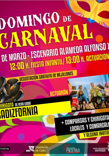 El domingo a partir de las 12.00 horas, en el escenario de la Alameda Alfonso XI se llevará a cabo la tradicional fiesta infantil, y a continuación se podrá disfrutar de varias actuaciones de agrupaciones carnavalescas, contando como colofón a la fiesta con la actuación de la chirigota de Vera Luque, “Los Cadizfornia”, como una colaboración de la Diputación de Cádiz.