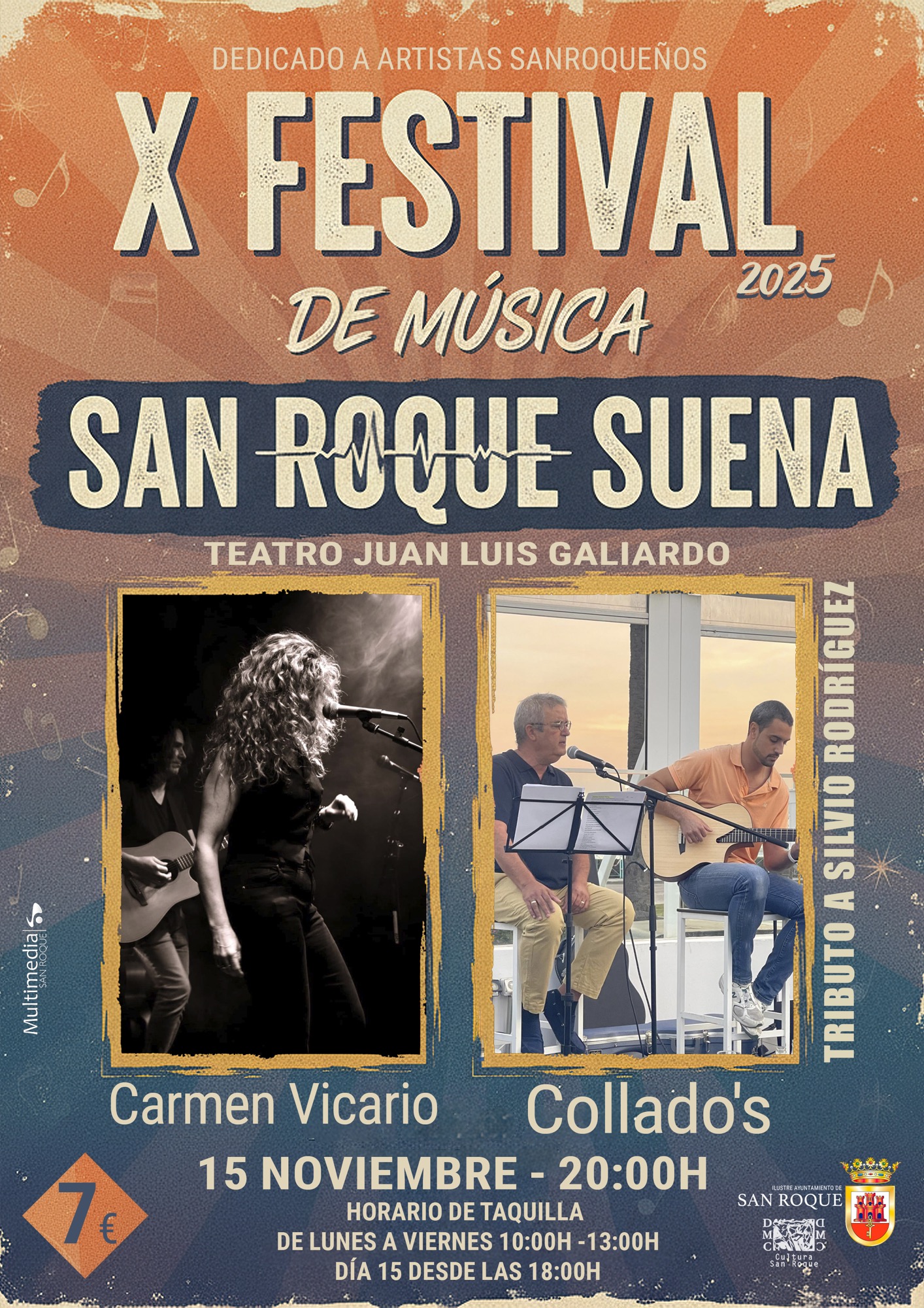 El X Festival de Música “San Roque Suena” se dedica este año a los artistas sanroqueños, por lo que este sábado 15 de noviembre actuarán la cantautora Carmen Vicario y el dúo Collado's, estos últimos con un tributo a Silvio Rodríguez.
