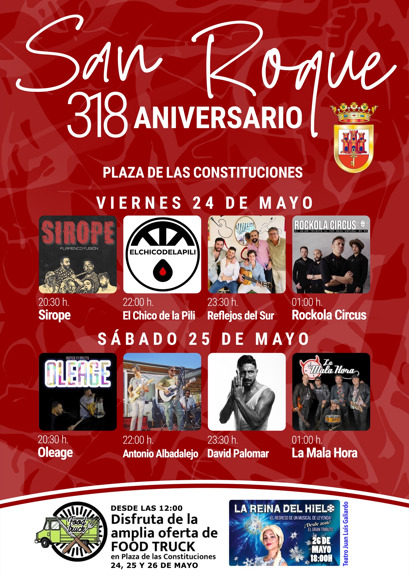 Este viernes 24 comienzan los actos preparados por el Ayuntamiento con motivo de la celebración del 318 Aniversario de la Fundación de San Roque. Hasta el domingo habrá conciertos en la Plaza de las Constituciones, Camiones de comida “foodtrucks” y un musical infantil “La reina del Hielo” en el Teatro Juan Luis Galiardo.