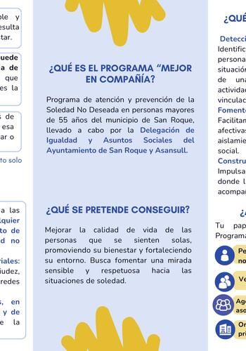 “Desde el Ayuntamiento de San Roque -continuó- somos conscientes de esta realidad, y a lo largo del año desarrollamos distintos programas dirigidos a las personas mayores. Podríamos hablar de los talleres de memoria, de los talleres de la Universidad Popular o, incluso, de las cenas de mayores de nuestras ferias, entre otras iniciativas. Pero me gustaría centrarme en esta ocasión en el programa Mejor en Compañía”.