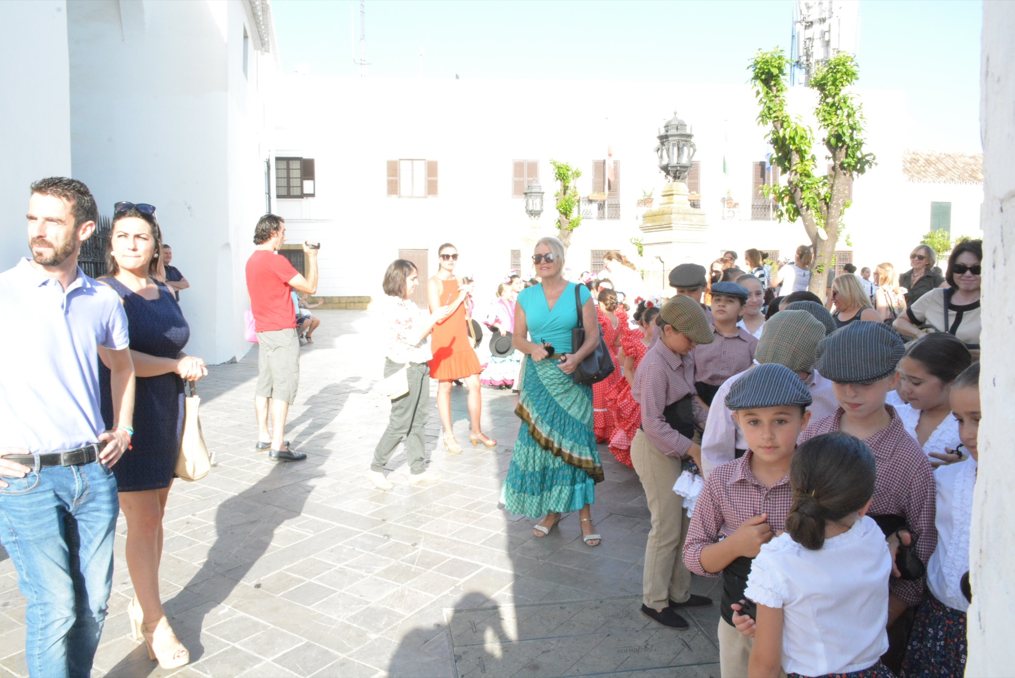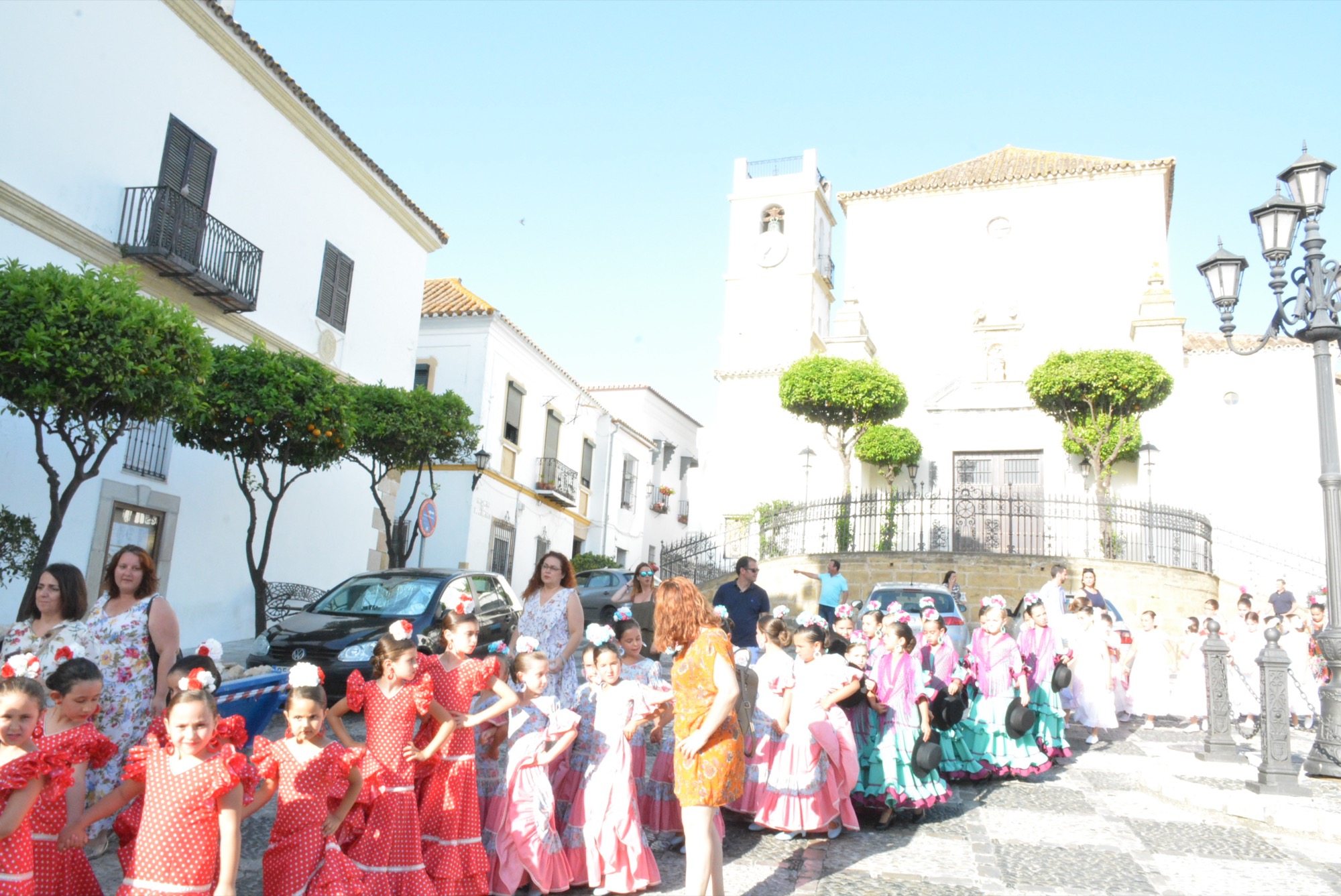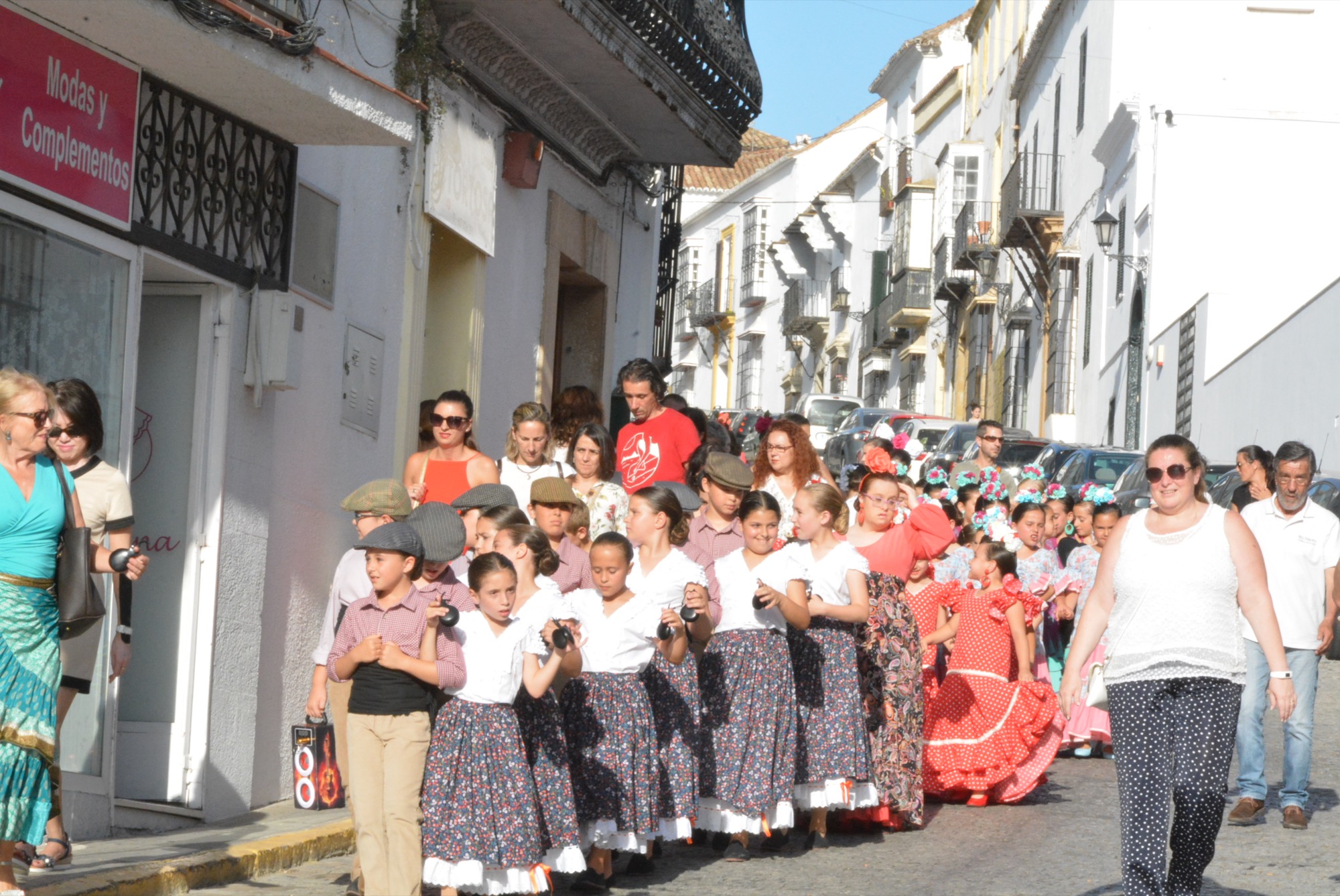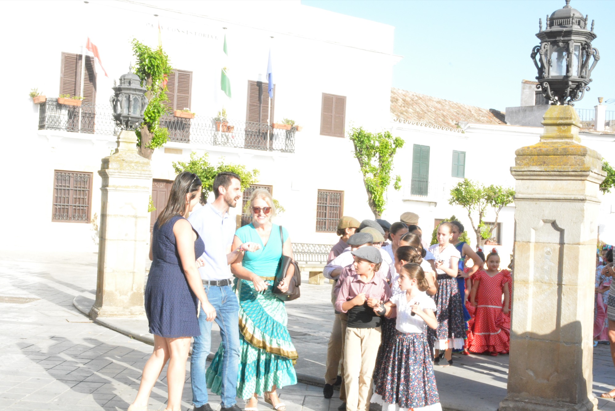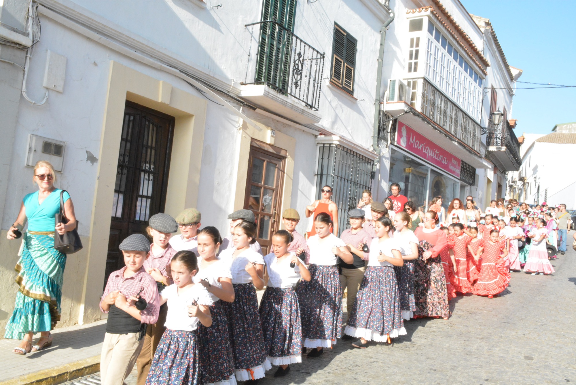 Estos mismos alumnos llegaron al Teatro desfilando desde la Plaza de Armas, donde fueron saludados por el edil de la Universidad Popular, David Ramos, y la concejal Mercedes Serrano. El centenar de niños y jóvenes, ataviados con trajes típicos, interpretaban el fandango de punta y tacón mientras recorrian la plaza de la Iglesia, la calle San Felipe y la Alameda Alfonso XI, hasta llegar al Teatro.