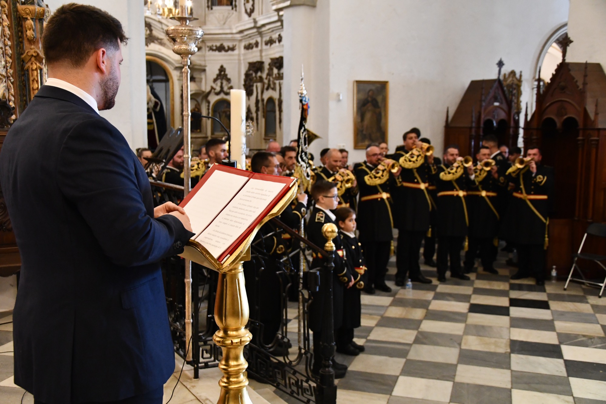 En el Pregón, de Andrés, estuvo acompañado por la Banda de Cornetas y Tambores Santa Bárbara de La Línea de La Concepción, que interpretó varias piezas intercaladas en el acto.