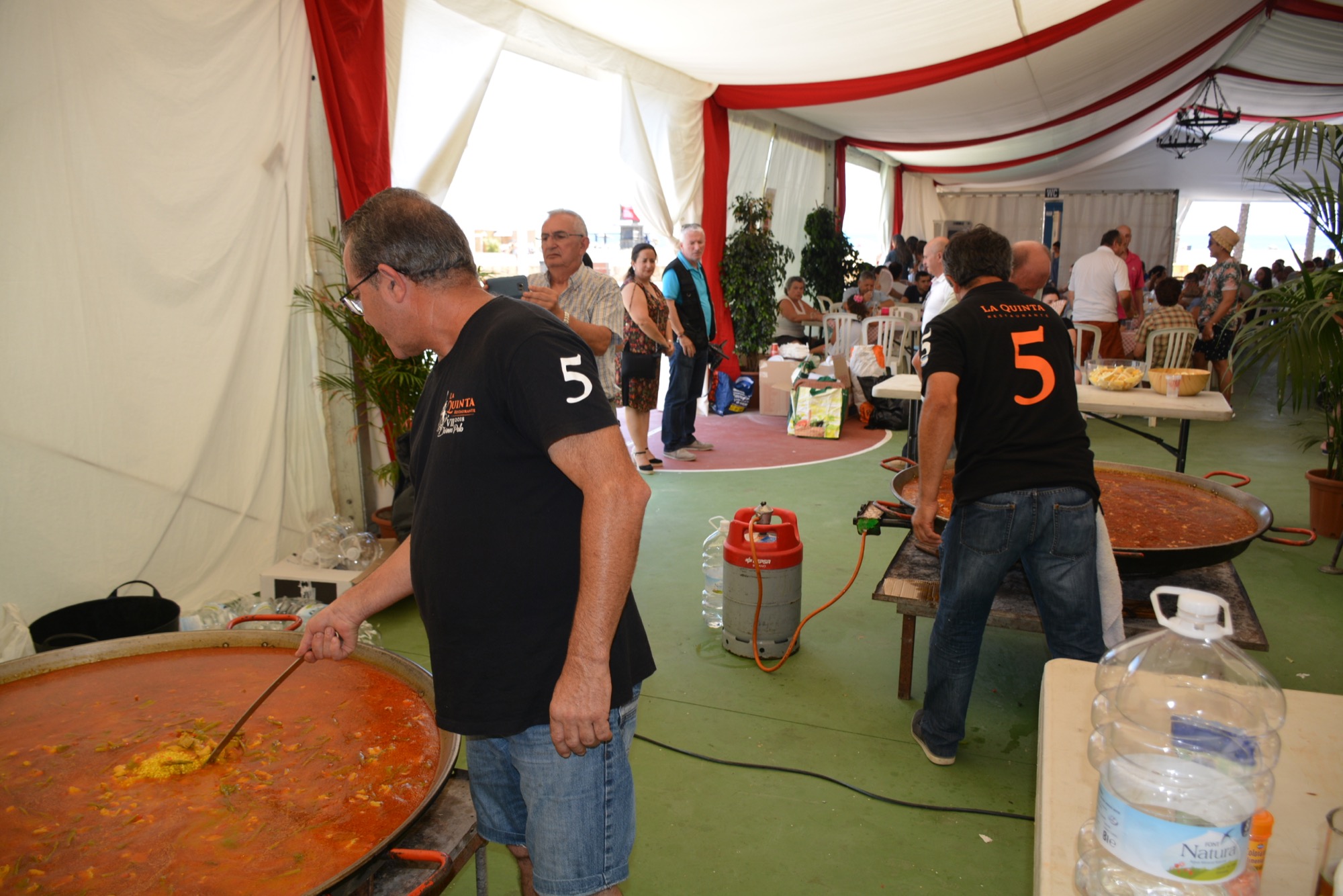 La espera del arroz para los asistentes que abarrotaban la caseta, cocinadas en dos paelleras por la Comisión de fiestas y la Asociación de Mujeres La Charca, fue amenizada por el grupo rociero Al son del Sur.