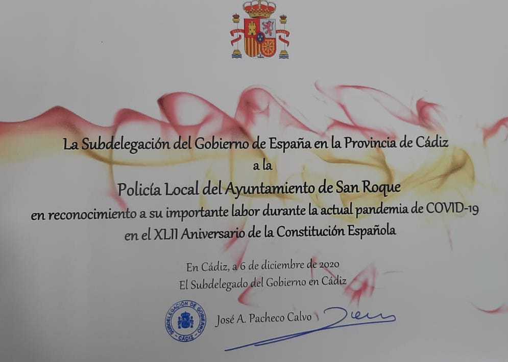 Entre estos reconocimientos, el subdelegado del Gobierno en Cádiz, José Antonio Pacheco Calvo, ha remitido al alcalde de San Roque, Juan Carlos Ruiz Boix, un diploma en reconocimiento a la labor fundamental del cuerpo local al velar por la seguridad de los vecinos de San Roque, “labor de información, de acompañamiento y de atención social y humana que ha resultado fundamental”, expresó el responsable de la institución en la provincia.
