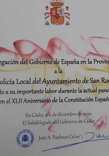 La Subdelegación del Gobierno en Cádiz ha homenajeado a la Policía Local de San Roque en el 42º aniversario de la Constitución, en un año especialmente significativo donde la institución gubernamental ha reconocido a aquellas personas, entidades o instituciones de la provincia cuya labor y trayectoria han destacado en la lucha contra la pandemia por Covid-19.