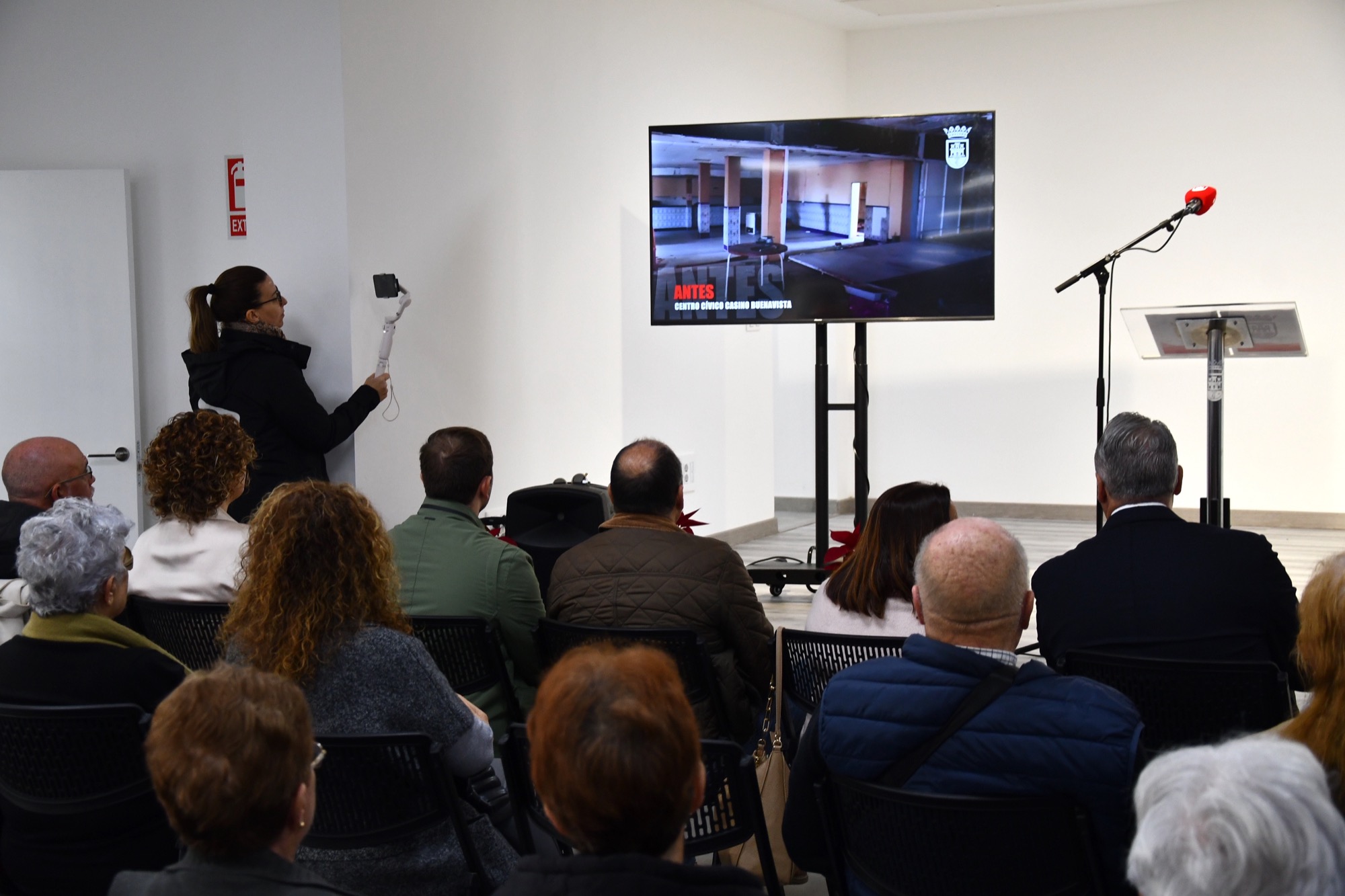 Tras el corte de la cinta inaugural, los asistentes tomaron asiento en el salón de actos y se les proyectó un vídeo en el que se muestra tanto el mal estado en el que se encontraba el antiguo casino como los trabajos que han sido necesarios para el nuevo edificio. El resultado es un local que, además de un gran patio, dispone de salas para varios usos, tanto municipales como de colectivos sociales. De hecho, la próxima semana comenzarán a impartirse talleres de memoria y muy pronto albergará talleres de la Universidad Popular.