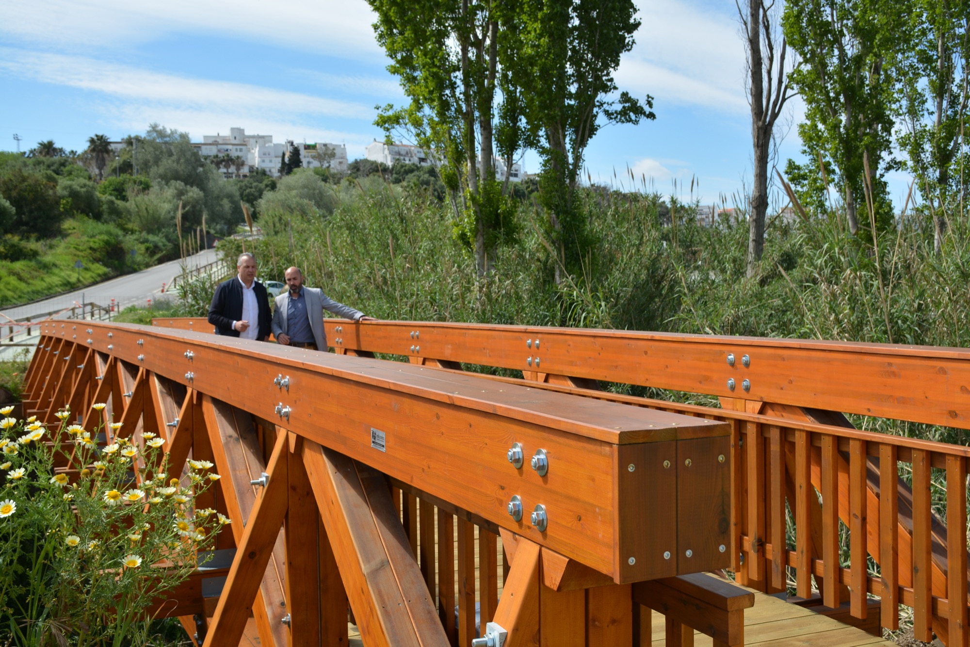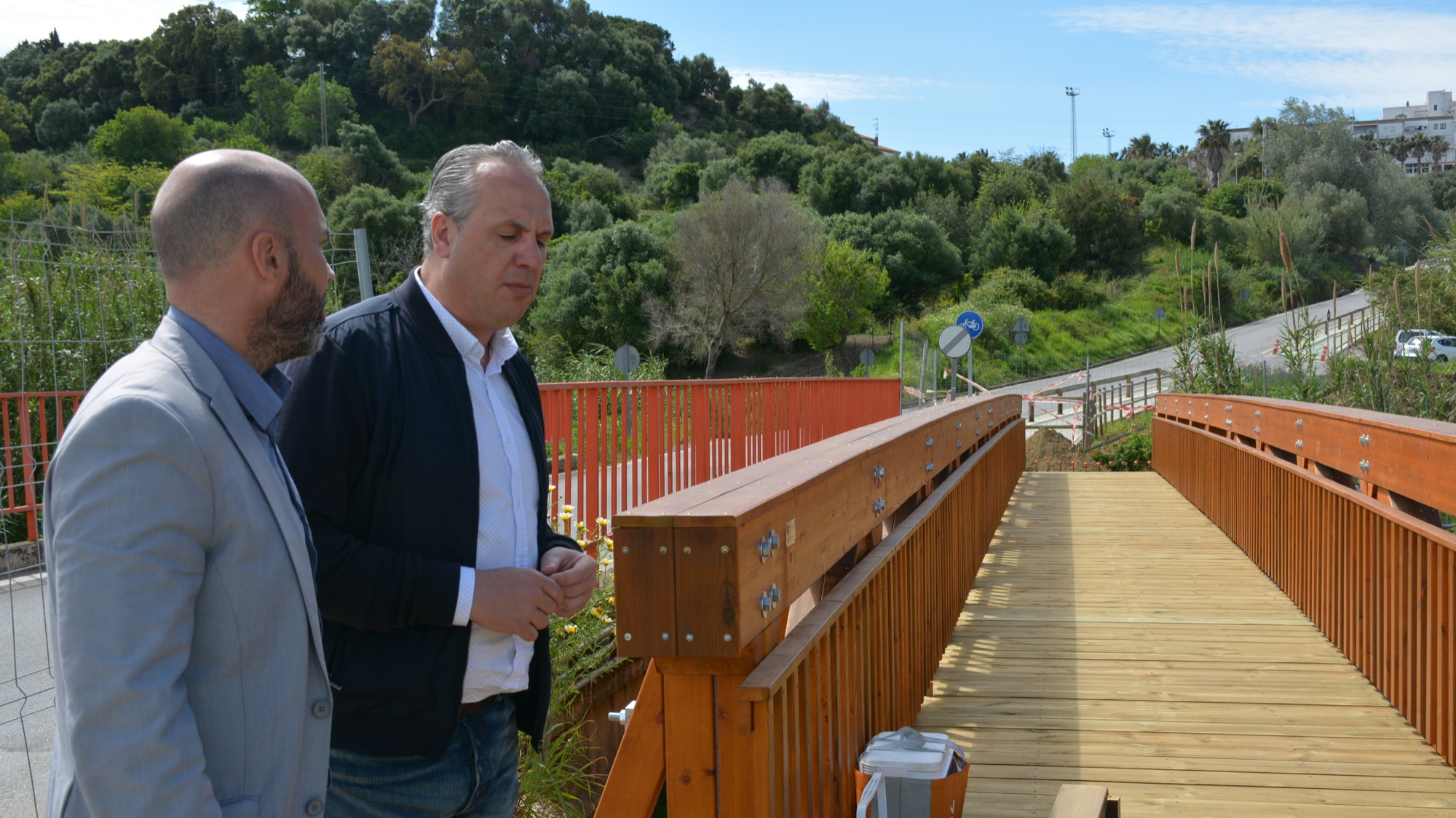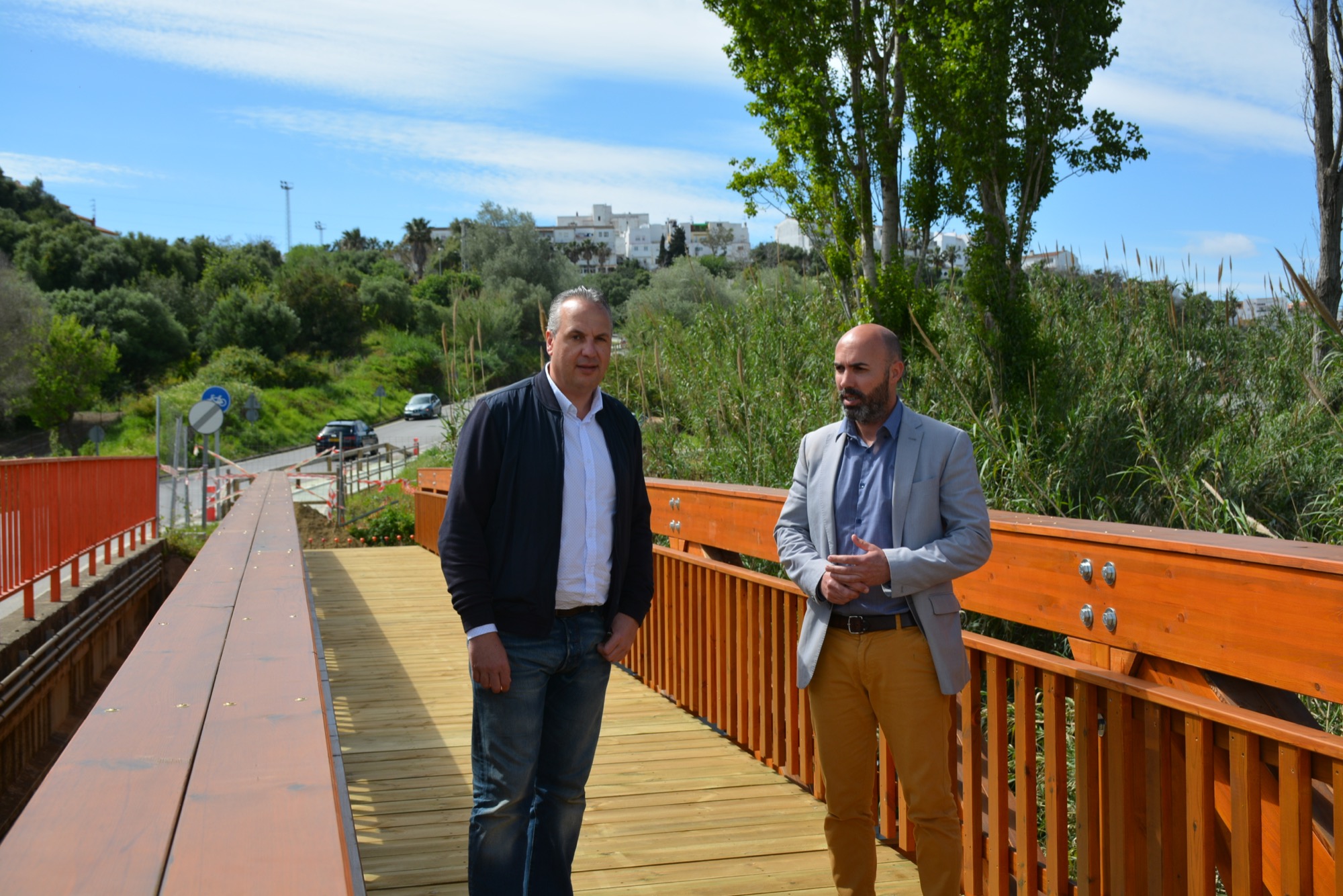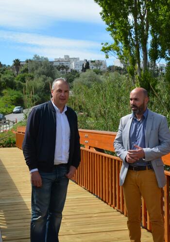 El alcalde de San Roque, Juan Carlos Ruiz Boix, y el primer teniente de alcalde y delegado de Urbanismo, Juan Manuel Ordóñez, han visitado esta mañana los trabajos que la empresa que ejecuta el tercer tramo del carril bici realiza en el arroyo Colmena.