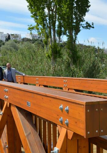 Se trata una pasarela de madera que une el primer tramo del carril bici, el que discurre desde el Polideportivo Vicente Blanca de Los Olivillos al arroyo Colmena; con el segundo tramo, el que va desde el arroyo al cruce de Santa Margarita.