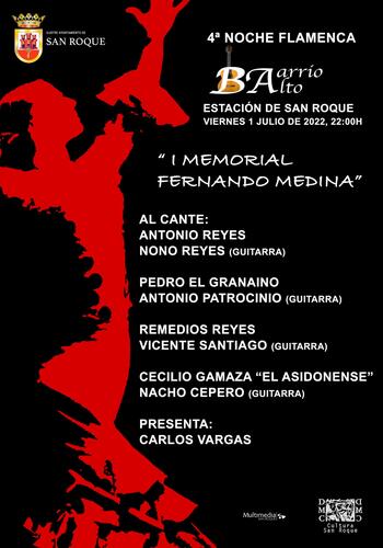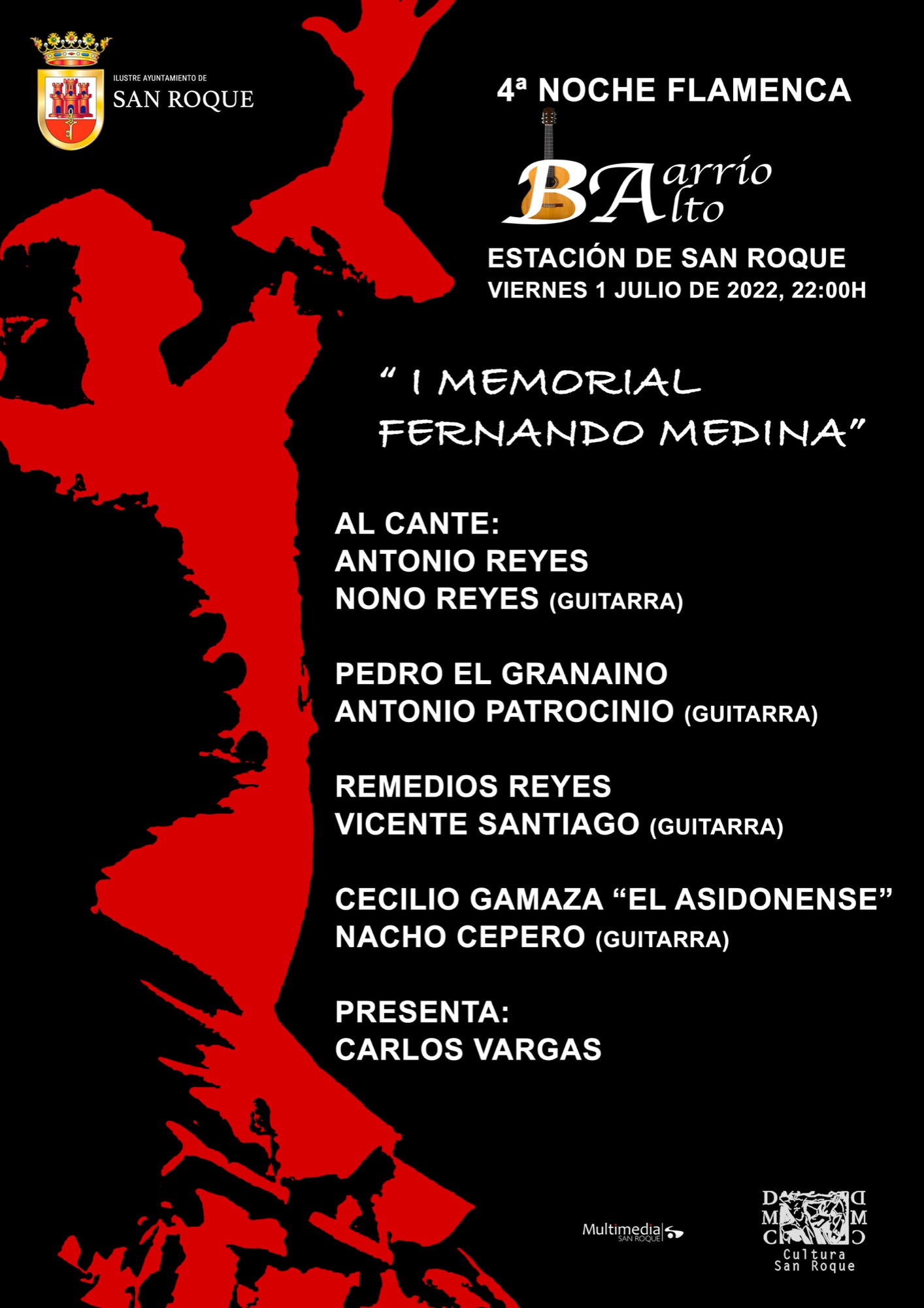 La Delegación de Cultura del Ayuntamiento de San Roque ha dado a conocer el programa de la 4ª Noche Flamenca del Barrio Alto, “I Memorial Fernando Medina” de la Estación de San Roque, que tendrá lugar el 1 de julio desde las 22 horas. La concejal de Cultura, Ana Ruiz, presentó el cartel junto al teniente de alcalde de la Zona Estación, Taraguilla y Miraflores, Juan Serván, y a Carlos Vargas, uno de los colaboradores del evento.