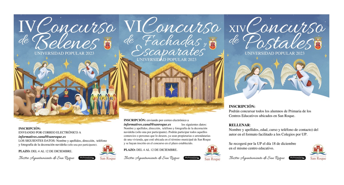 La Universidad Popular de San Roque fallará durante los próximos días los tres concursos que organiza con motivo de las fiestas de Navidad, el de Belenes, el de Postales Navideñas, y el de Fachadas e Interiores de viviendas y comercios. En cuanto a los dos últimos, el próximo martes 12 finaliza el de Fachadas, mientras que el 18 se recogerán los trabajos del de Postales Navideñas.