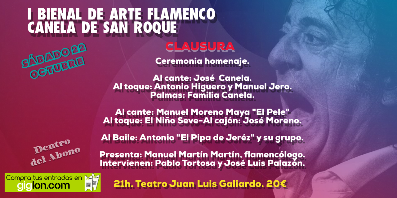 El último acto de la I Bienal Flamenca “Canela de San Roque” será en el Teatro Juan Luis Galiardo, que acogerá mañana sábado 22 de octubre el Recital de Clausura, una ceremonia en homenaje a Canela de San Roque. Se llevará a cabo a partir de las 21.00 horas, y la presentación correrá a cargo del flamencólogo Manuel Martín Martín.