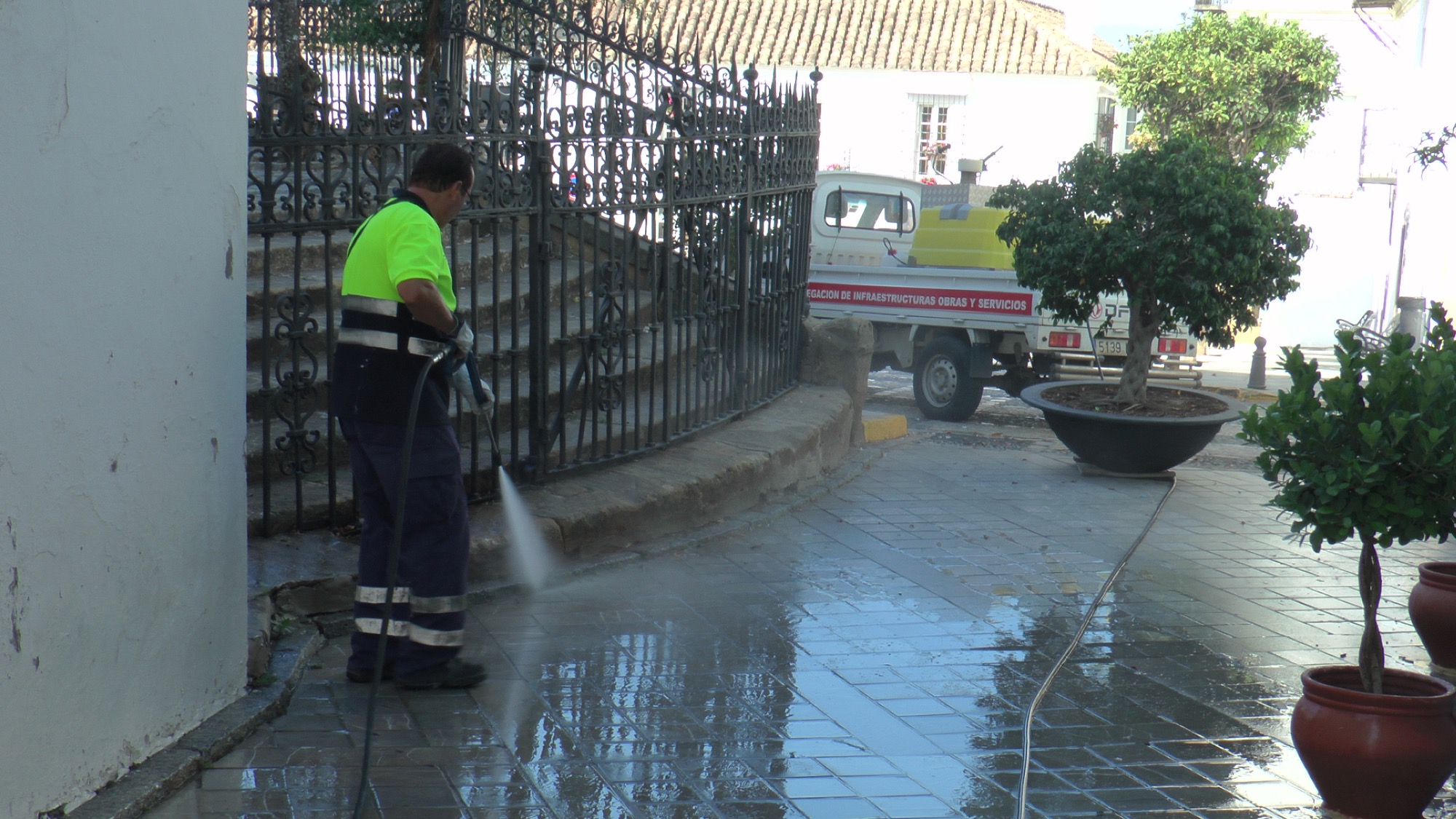 Operarios del Plan Únete, que lleva a cabo la Delegación de Limpieza Viaria, que coordina el teniente de alcalde Juan Serván, han desarrollado su labor hoy martes tanto en los alrededores de la iglesia de Santa María La Coronada, en San Roque Casco, como del Centro de Salud de la Estación de San Roque.
