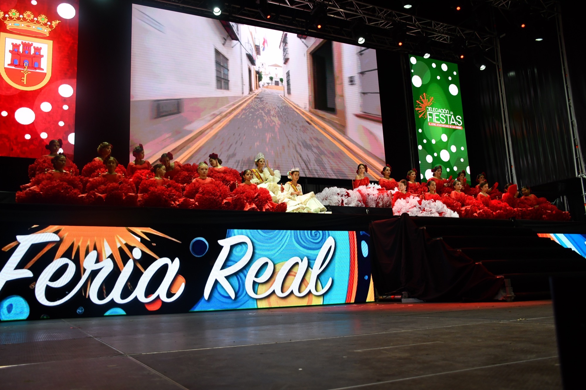 El escenario contaba con pantallas en las que se reflejaban imágenes sobre la Feria Real y sus protagonistas preparadas por Multimedia, y en dos trabajadores de esta empresa municipal, Elena García y Salva Serrano, recayó la responsabilidad de presentar el acto, que fue transmitido en directo por Canal San Roque RTVM y a través de redes sociales.
