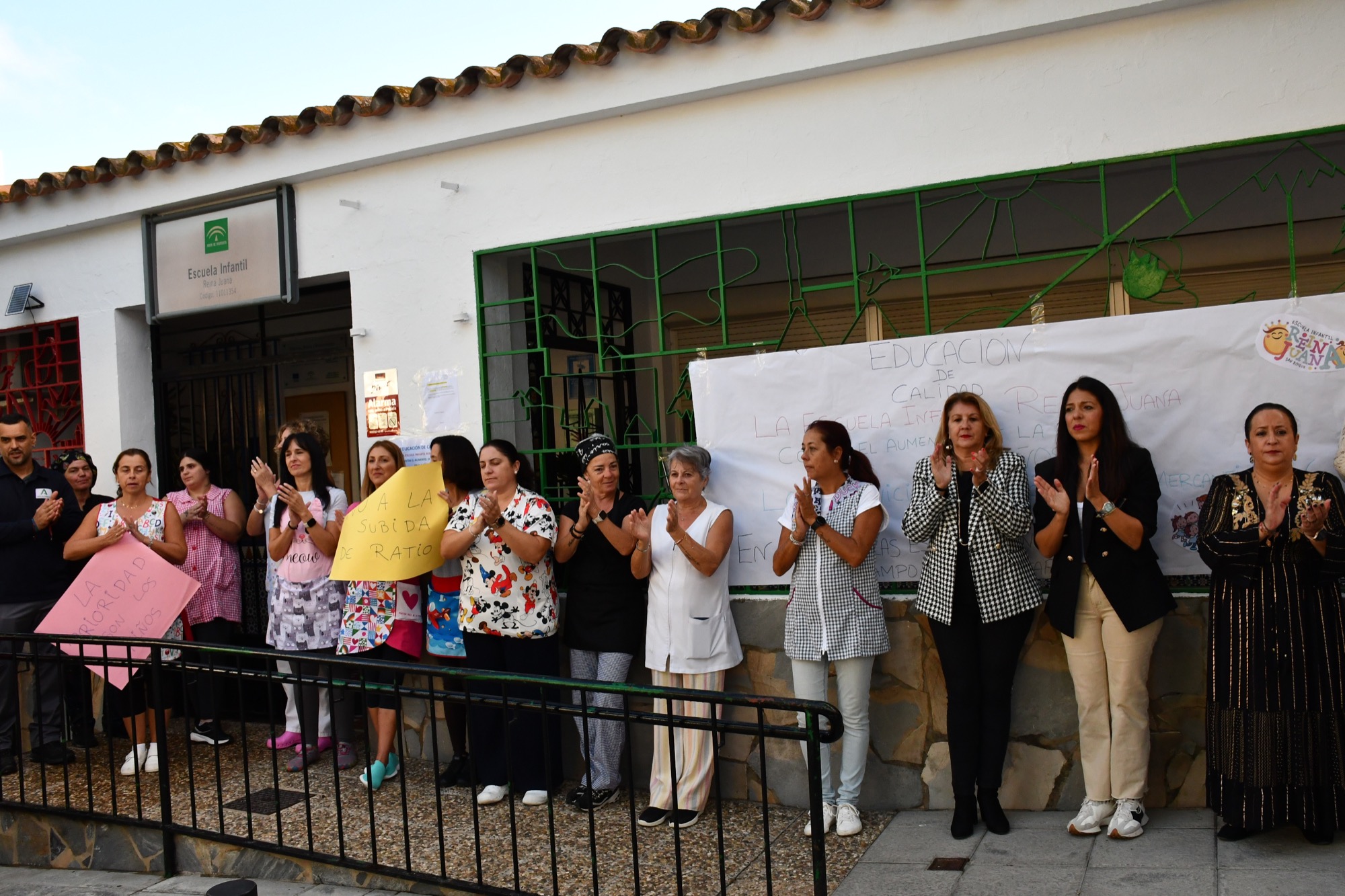 La teniente de alcalde de Educación, Belén Jiménez, junto a otros ediles del Equipo de Gobierno, ha mostrado presencialmente su respaldo a la Escuela Infantil “Reina Juana”, cuyo personal docente se ha concentrado durante media hora, este martes, a las puertas del centro en rechazo a las pretensiones de la Consejería de Educación de la Junta de Andalucía de incrementar el ratio de alumnos por clase. Esto perjudicaría tanto a la educación de calidad, como a las capacidades de los docentes de atender a los pequeños de 0 a 3 años. Al tratarse del único centro catalogado como escuela infantil de carácter público, sería el único afectado también en el municipio por el incremento de ratio de alumnos.