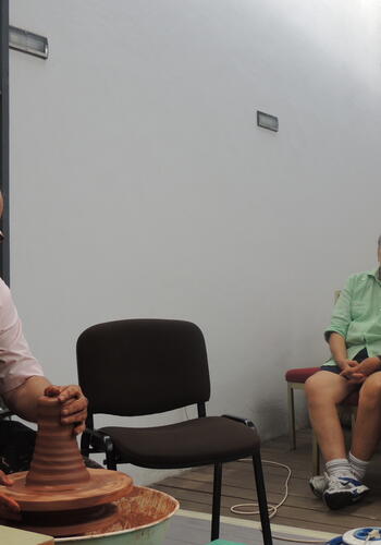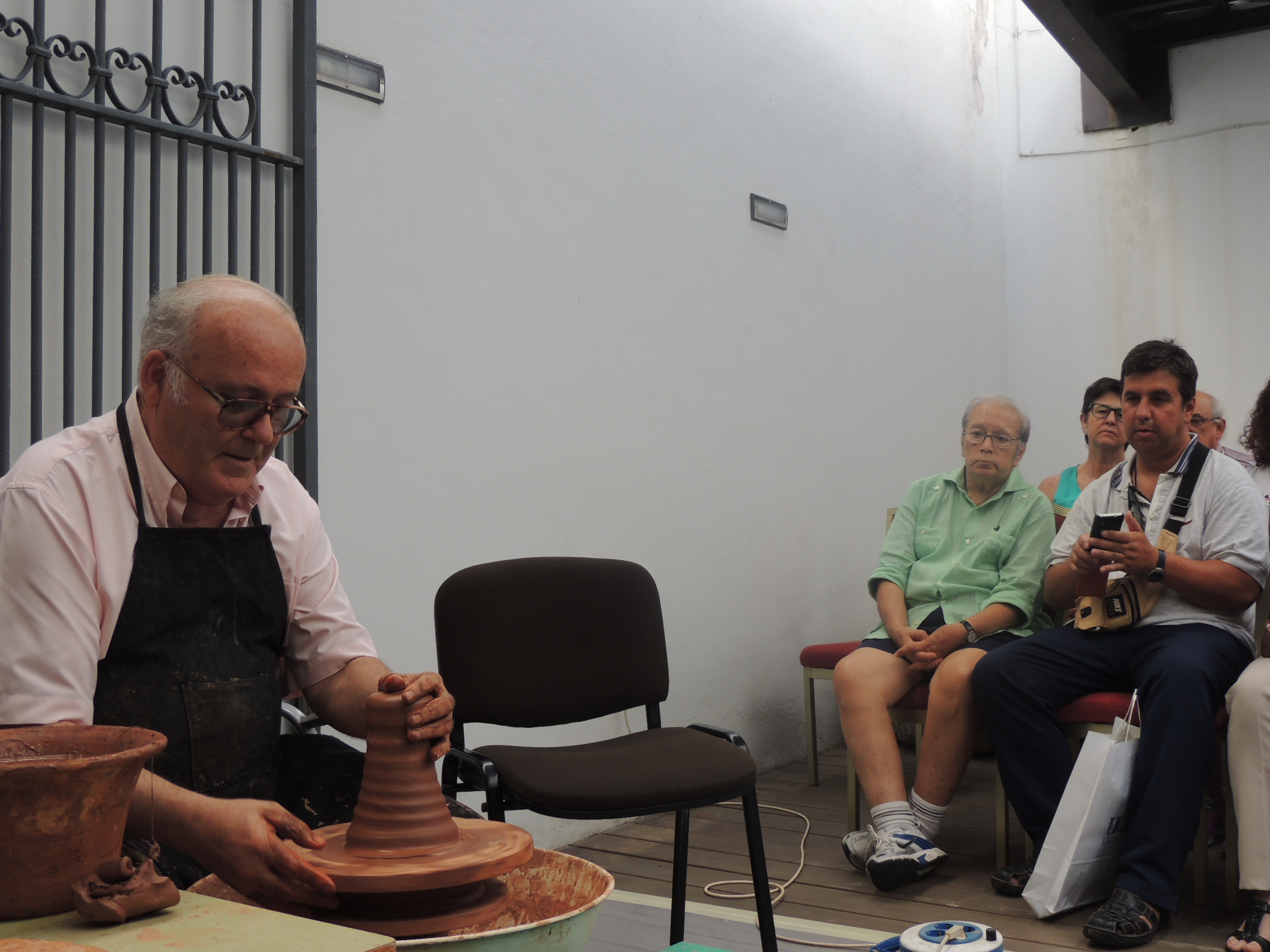 El patio interior del Museo de San Roque se ha convertido por unas horas en el taller de Bellón y la conferencia ha girado alrededor del torno, el barro y las manos del maestro ceramista que han modelado un ánfora típica romana.