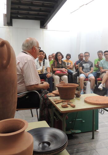 Bellón ha explicado el proceso para fabricar estos recipientes cerámicos de gran tamaño con dos asas y un largo cuello estrecho utilizados por los habitantes de Carteia. La sesión práctica ha partido de varias piezas realizadas por él con anterioridad y ha mostrado todo el proceso de fabricación de un ánfora romana. “El proceso consta de la fabricación de cuatro partes que requiere un día completo, como no tenemos tiempo he traído las piezas previamente fabricadas así que aquí en primer lugar mostraré como se comienza a hacer el ánfora, después pondremos la parte de arriba, después las asas y finalmente seccionaré el recipiente para mostrar las paredes por dentro y poder explicar cómo es por dentro la pieza” ha señalado el ceramista.