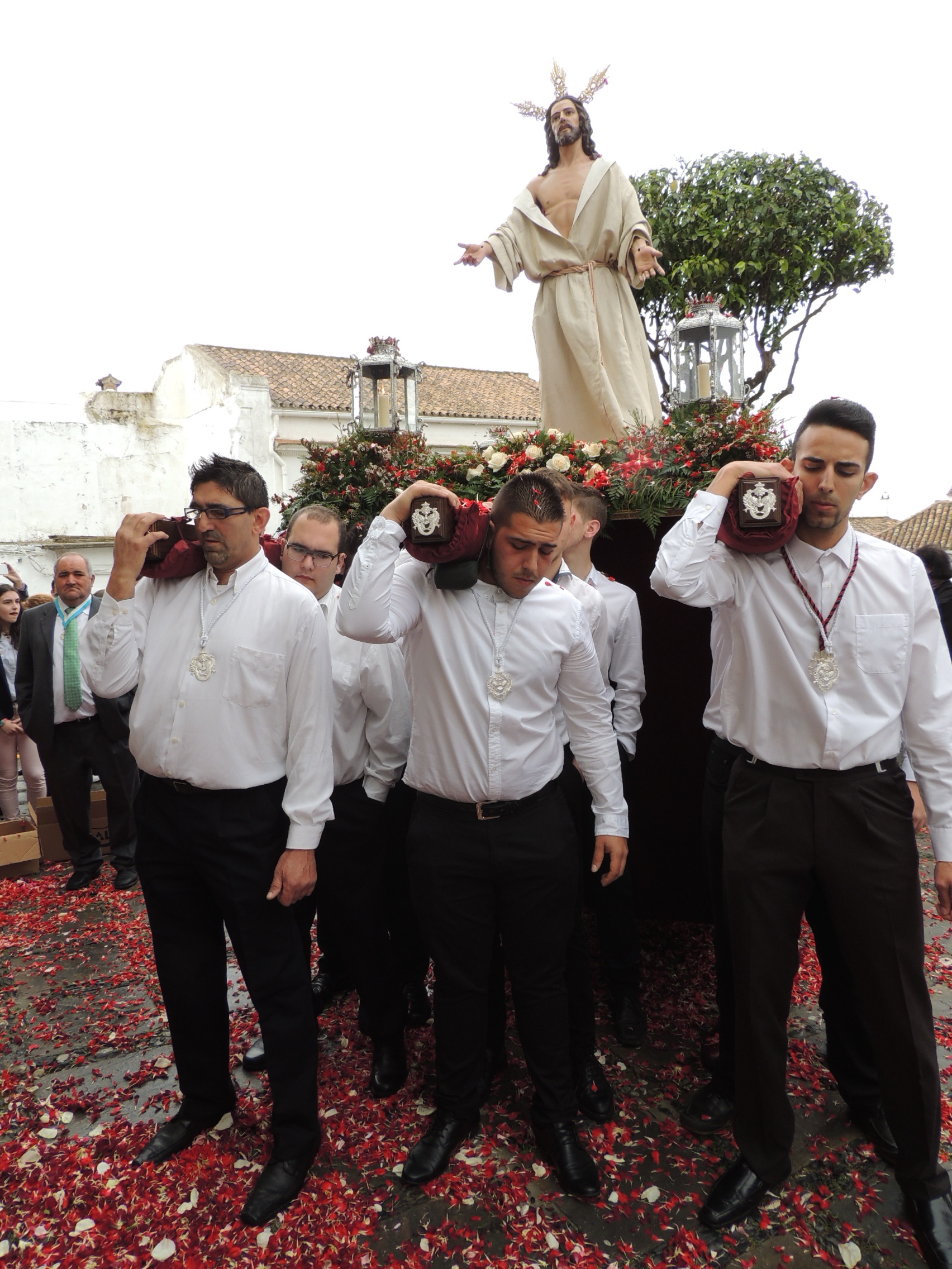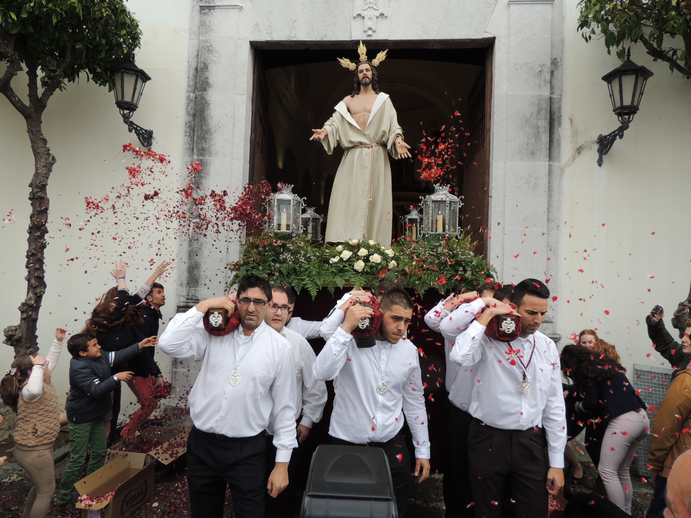La procesión del Cristo Resucitado, prevista en San Roque Casco para el mediodía de hoy, Domingo de Resurrección, ha tenido que ser suspendida debido al mal tiempo. La imagen del Cristo fue llevada por sus cargadores hasta el atrio de la Parroquia Santa María Coronada, donde recibió una lluvia de pétalos.