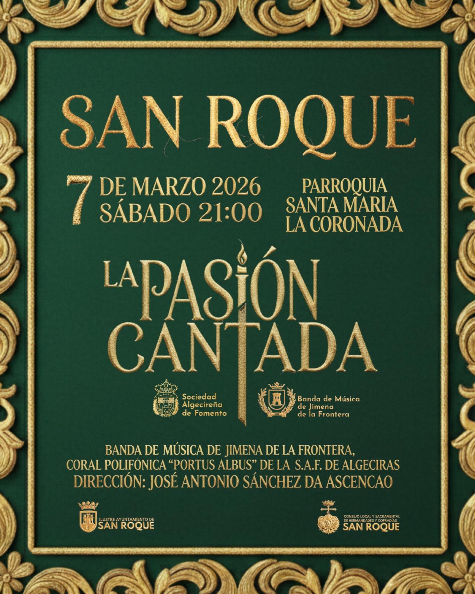 La Banda de Música de Jimena y de la Coral Portus Albus de la Sociedad Algecireña de Fomento, ambas dirigidas por José Antonio Sánchez do Ascensao, interpretarán nuevas piezas de música sacra y marchas características de Semana Santa, con las voces de la coral algecireña.