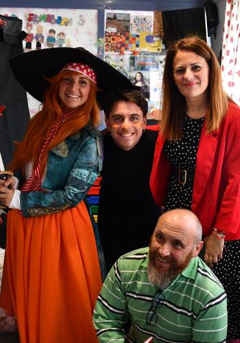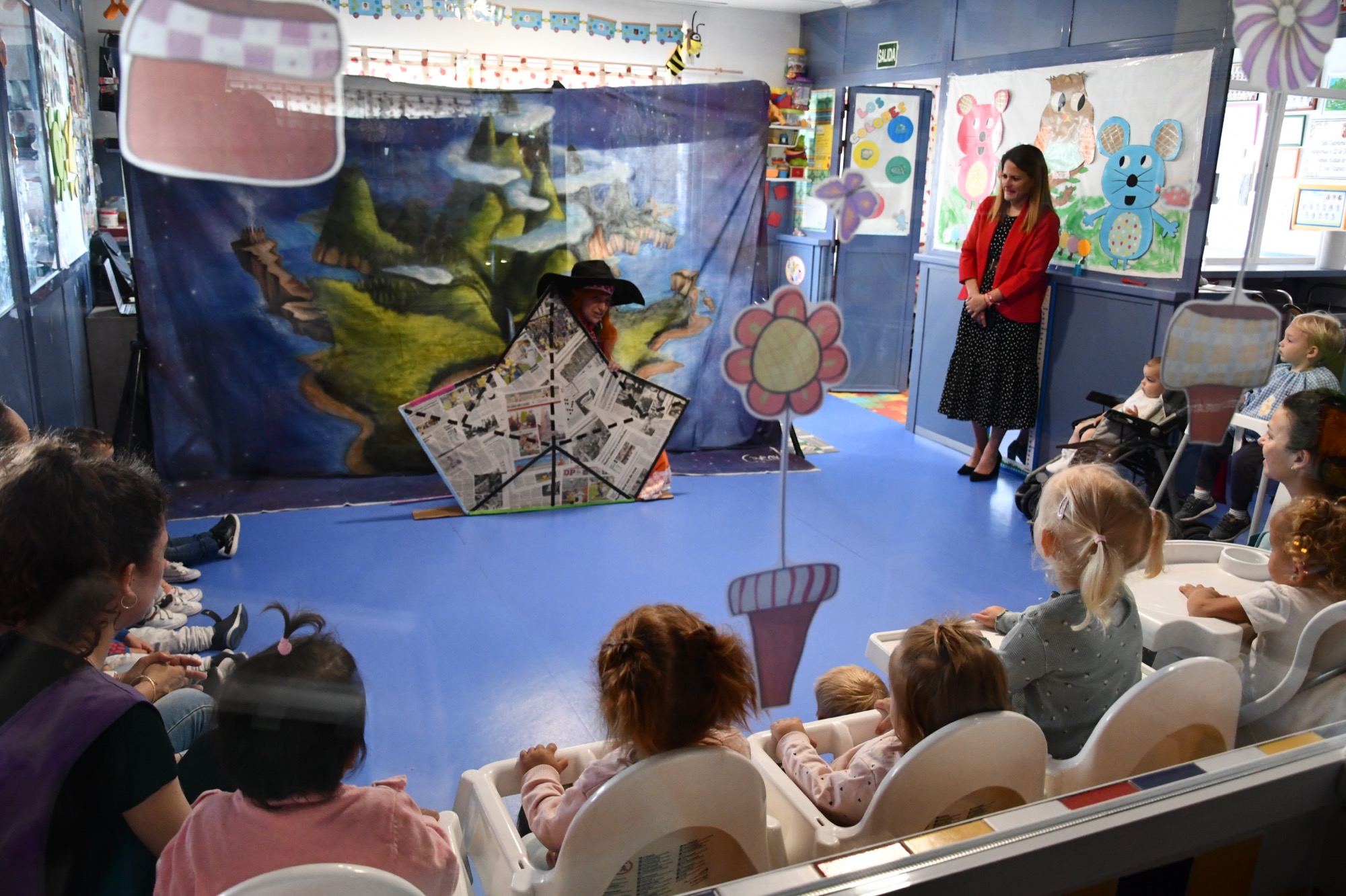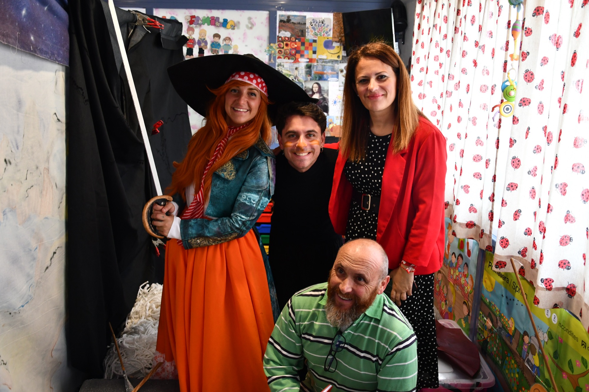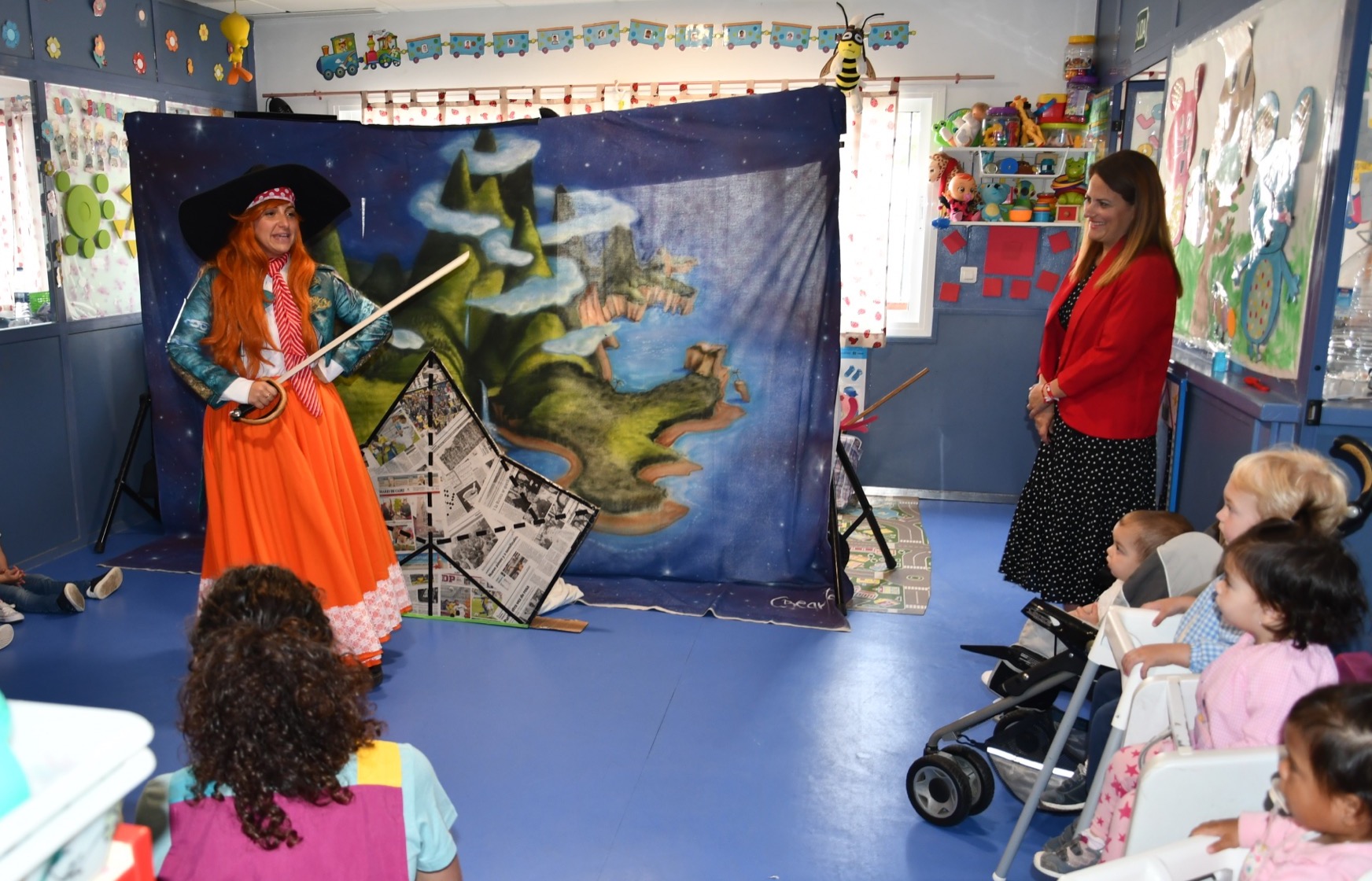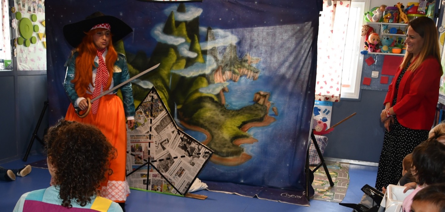 La Pirata Catarata ha recalado hoy, jueves, en el Centro de Educación Infantil (CEI) Campanillas de San Enrique, donde ha buscado un tesoro acompañado por los 25 niños y niñas de la guardería y por la teniente de alcalde de Bibliotecas, Mónica Córdoba.
