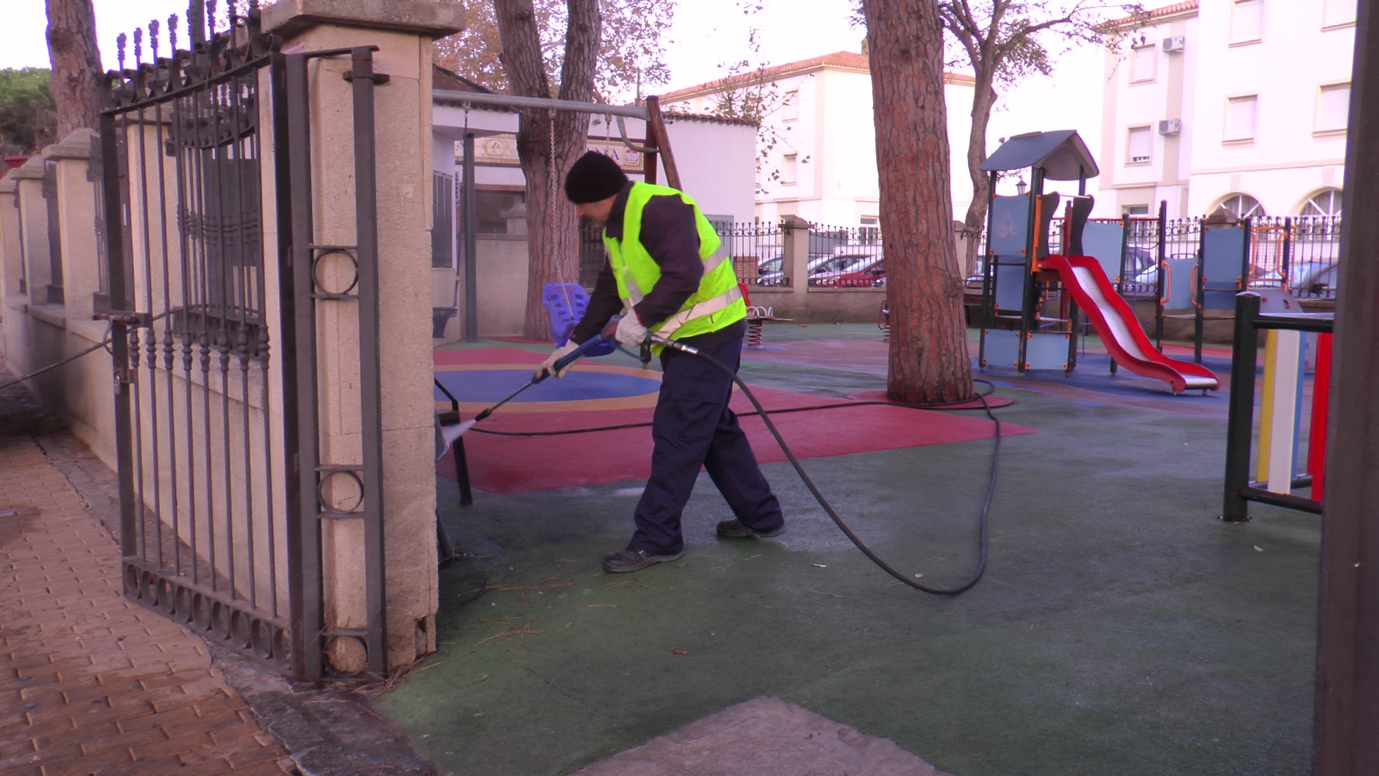 En el Casco, se ha repasado el parque infantil de la Alameda con mangueras con agua a presión, mientras que se ha empleado la máquina barredora por la parte más cercana a la Plaza de Andalucía.