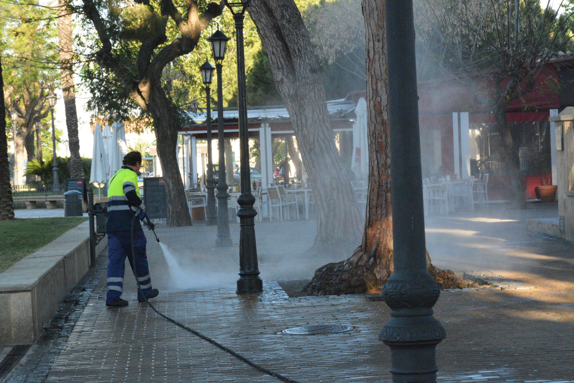 Paralelamente, en la Alameda Alfonso XI, en el Casco, se ha realizado una limpieza con cubas con agua a presión por todo el perímetro del parque infantil y por los distintos establecimientos hosteleros de dicha zona.