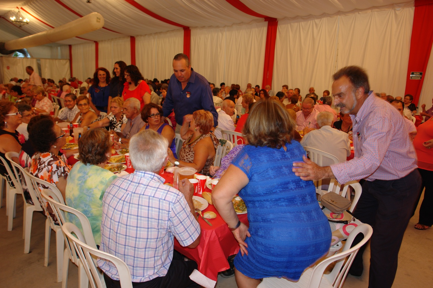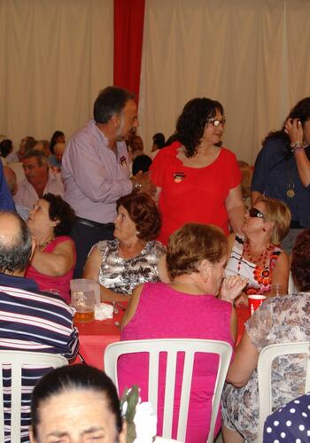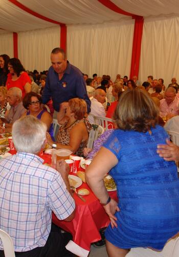 El alcalde, Juan Carlos Ruiz Boix, y varios ediles del Equipo de Gobierno saludaron a los asistentes y les repartieron presentes, algunos de ellos elaborados por los usuarios de la Unidad de Memoria que funciona en la Residencia Municipal de Mayores gracias a una subvención de Cepsa. La Delegación Municipal de Bienestar Social distribuyó previamente 360 pases para asistir a esta cena entre mayores de 60 años de San Roque Casco. A ellos se sumaron otros cuarenta usuarios de la Residencia y de las viviendas tuteladas, así como la Corte de Honor Juvenil. A los postres, tomaron la palabra en el escenario el alcalde, la concejal de Bienestar Social, Mercedes Sánchez, y la responsable de Comunicación del Grupo Cepsa, Amalia Puigdengolas. Ruiz Boix explicó que, en total, unos 1.500 abuelos y abuelas están disfrutando de estas cenas en las distintas ferias que se celebran este verano en todo el término municipal. Además de a Cepsa, que patrocina varias de ellas, mostró su agradecimiento a las otras empresas que han ofrecido su financiación, “porque sin esta colaboración económica no podríamos haceros desde el Ayuntamiento este homenaje cómo os mereceis por el esfuerzo de tantas décadas y el cariño que nos habeis dado”. También se refirió a las felicitaciones recibidas por la decisión de cambiar el horario de la comida, de almuerzo a cena, así como a los diversos obsequios realizados por los usuarios de la Unidad de Memoria. De hecho, anunció que ante el éxito de este servicio, desde Bienestar Social se está planteando realizar talleres similares en todos los centros de día de la Tercera Edad que funcionan en el municipio. Mercedes Sánchez fue muy breve, y además de los agradecimientos a todos los que han colaborado para llevar adelante la experiencia, mostró su satisfacción por participar por primera vez en este homenaje a los abuelos y abuelas. Palabras similares tuvo Amalia Puigdengolas, quien resaltó lo importante que es para Cepsa el colaborar en este tipo de iniciativas, y deseó a los asistentes que lo pasaran lo mejor posible.