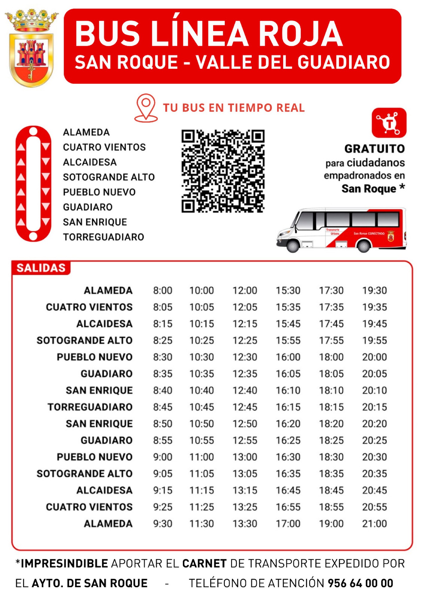 Los autobuses urbanos retoman sus horarios de invierno, a partir de este martes 29 de septiembre, tras la reorganización realizada para el servicio especial de verano. El servicio es gratuito para los empadronados en San Roque con la tarjeta que se solicita en las alcaldías de barrio y existe un código QR que permite el seguimiento en tiempo real del vehículo.