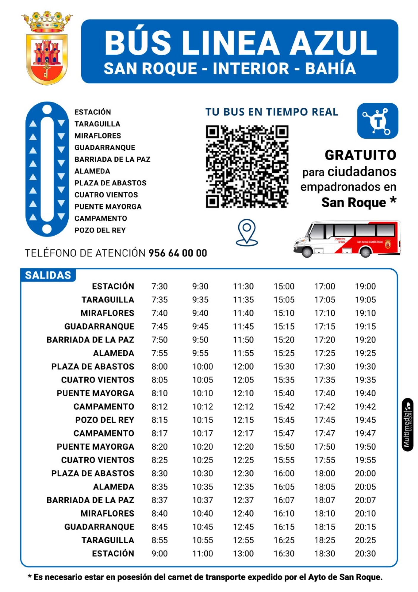 Por su parte, la Línea Azul que conecta San Roque Casco con la zona Interior y Bahía, comienza en Estación y termina en Pozo del Rey, inicia su recorrido a las 07:30 horas de la mañana desde la Estación y su última salida es a las 19:00 horas. Desde Pozo del Rey la primera salida es a las 08:15 y la última a las 19:45 horas.