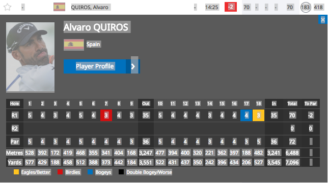 Quirós entregaba una tarjeta con un total de quince pares de campo, birdie en el 7; además de sumar en su tarjeta un espectacular eagle en el 18 desde la salida del 17 para terminar con -2.