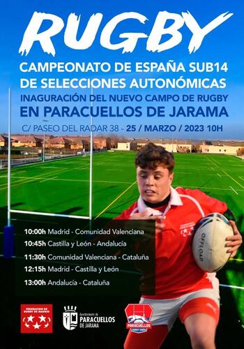 La escuadra de Andalucía de rugby Sub 14 acude este sábado 25 de marzo al nuevo campo de Paracuellos del Jarama, en las instalaciones deportivas del paseo del Radar, de la Comunidad de Madrid, para competir en la nueva edición del Campeonato de España de Rugby de selecciones autonómicas. Éste enfrentará a los equipos de Madrid, Comunidad Valenciana, Castilla-León y Cataluña en un evento organizado por el Ayuntamiento de Paracuellos, la Federación Madrileña de Rugby y el Club Paracuellos Rugby Unión.