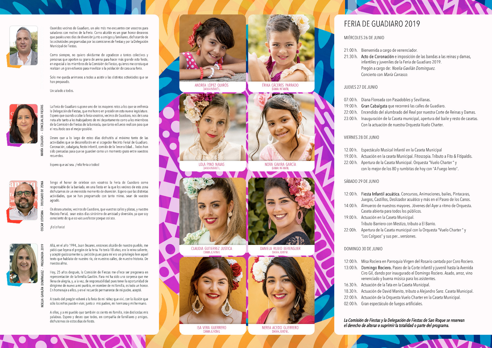 Hoy miércoles, a las 21 horas del miércoles se dará la bienvenida a cargo de venenciador, y a las 21:30 comenzará el acto de Coronación e imposición de bandas a las reinas y damas, infantiles y juveniles de la Feria de Guadiaro 2019. Durante el acto, Noelia Gavilán Domínguez pronunciará el Pregón de las fiestas, y tendrá lugar un concierto con María Carrasco.