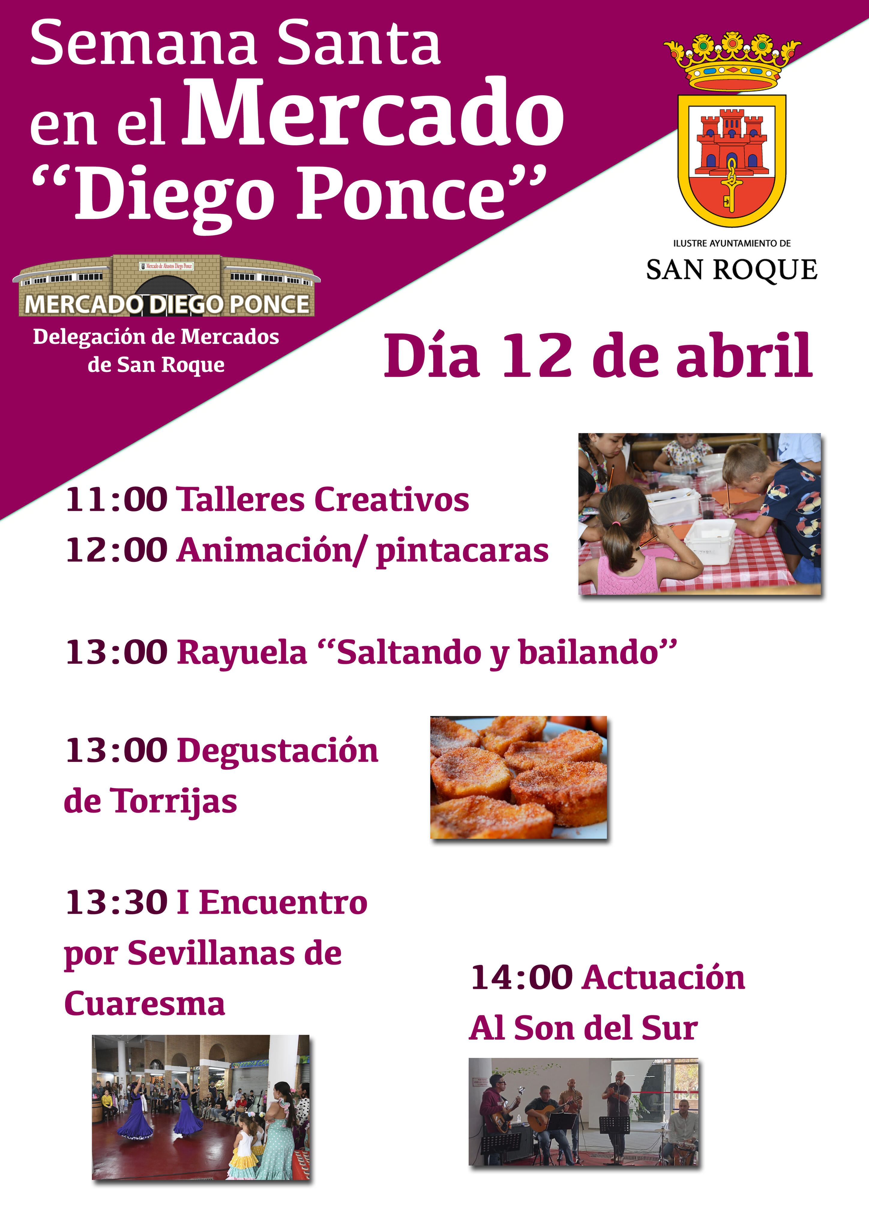 Con motivo del inicio de la Semana Santa, la Delegación de Mercados, que dirige el teniente de alcalde David Ramos, ha organizado una densa agenda de actividades para niños y mayores para la mañana de este sábado 12 de abril en el Mercado Municipal Diego Ponce. Comenzarán a las 11.00 con unos talleres creativos, para finalizar con una actuación del grupo rociero “Al Son del Sur”.