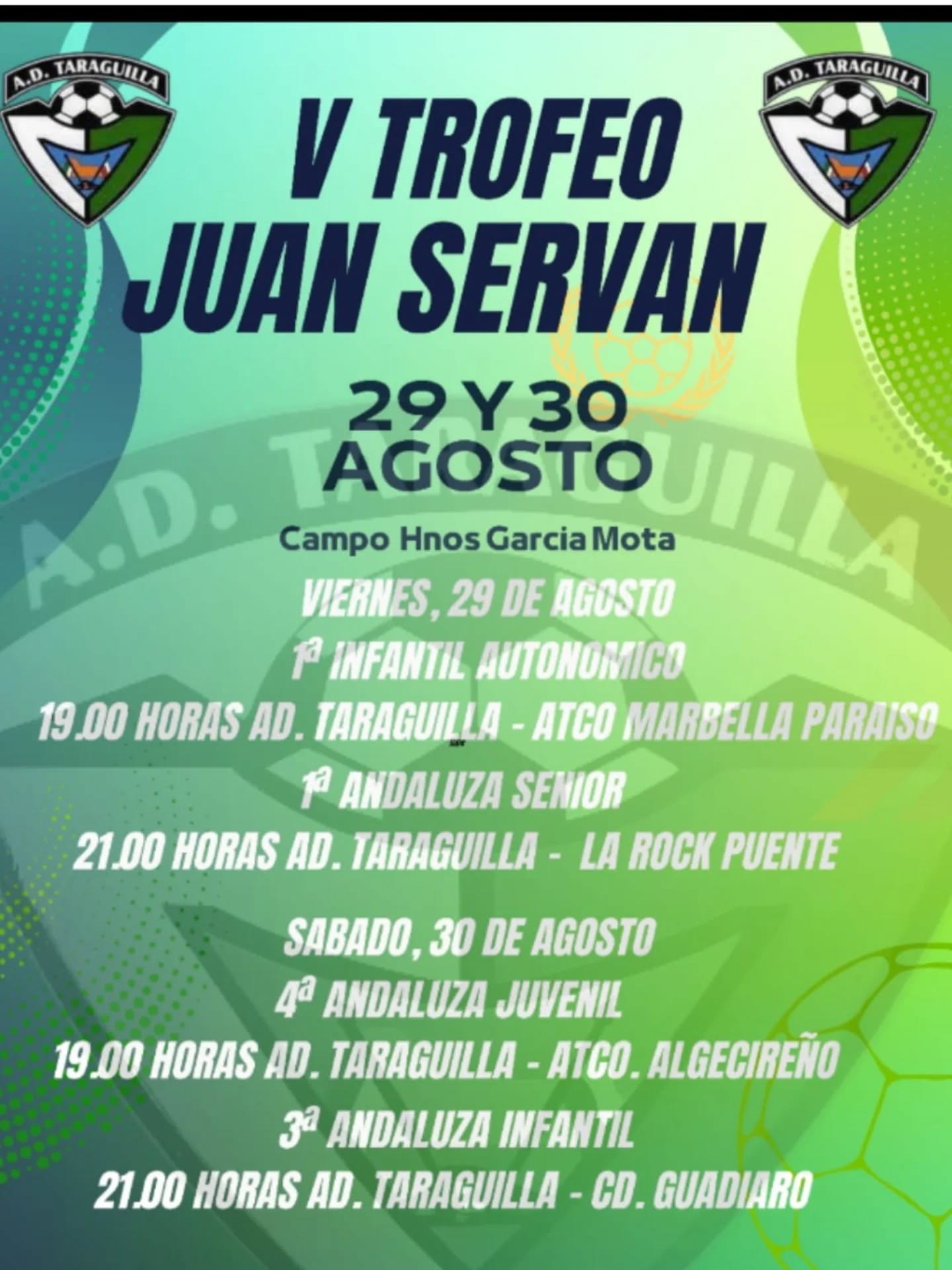 Este viernes 29 de agosto se inicia el V Trofeo Juan Serván en el Municipal Hermanos García Mota, torneo de fútbol 11 en honor a quien fuera presidente de la entidad organizadora del evento, la AD Taraguilla, y actual teniente de alcalde del Ayuntamiento de San Roque.