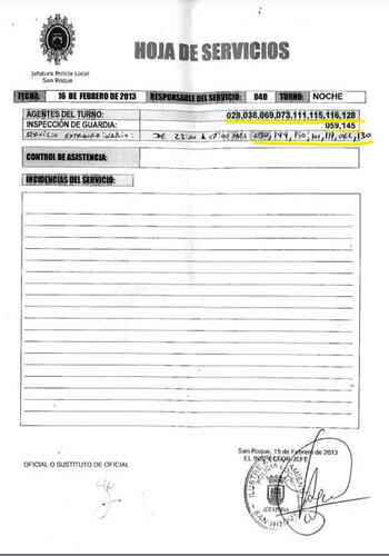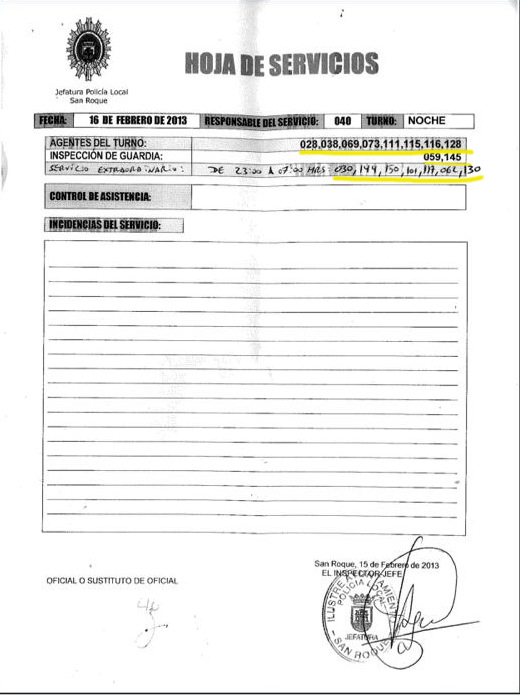 El teniente de alcalde delegado de Seguridad Ciudadana, Juan Manuel Ordóñez, ha hecho pública hoy, sábado, la hoja de servicios de la Policía Local que demuestra que en la noche del sábado de Carnaval en San Roque (16 de febrero) había un total de 18 policías de servicio. “Este documento prueba -indicó- que el señor Fernando Palma (portavoz municipal del PP) miente cuando afirma que esa noche sólo trabajaban cuatro agentes”.