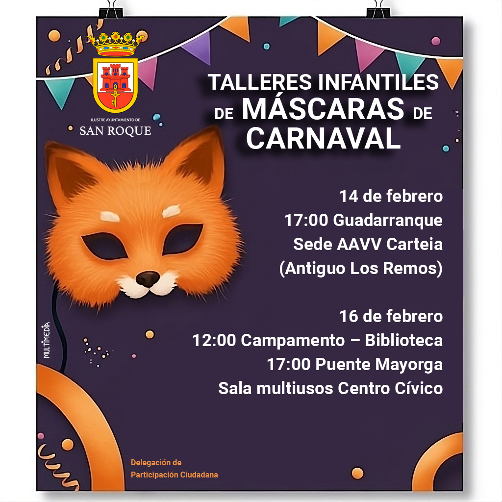 La Delegación de Participación Ciudadana organiza una serie de talleres infantiles para la realización de Máscaras de Carnaval, que se llevarán a cabo entre el viernes 14 y el domingo 23 de febrero en cada uno de los núcleos de población del municipio. Estos talleres, de carácter gratuito, correrán a cargo de la entidad Consejo de los Cinco Dragones.